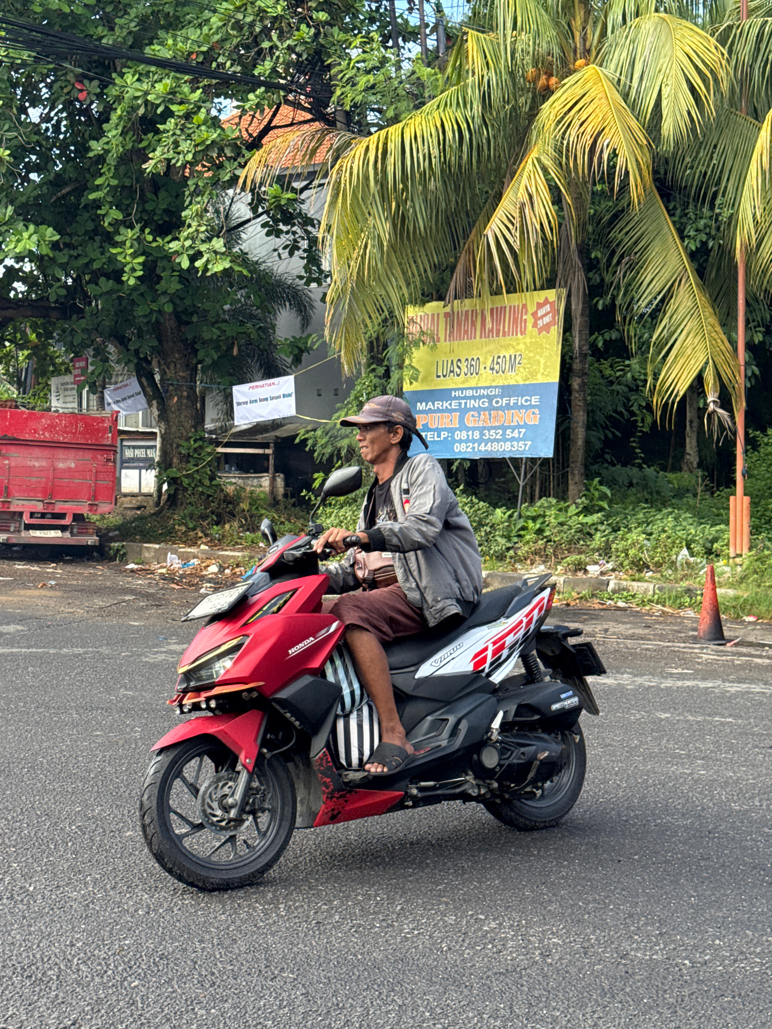 A man with a cap is riding a red Honda motorcycle on a road in Kuta Selatan, Indonesia. He is wearing sandals and striped pants. In the background, there are trees, a sign with information about Puri…read more