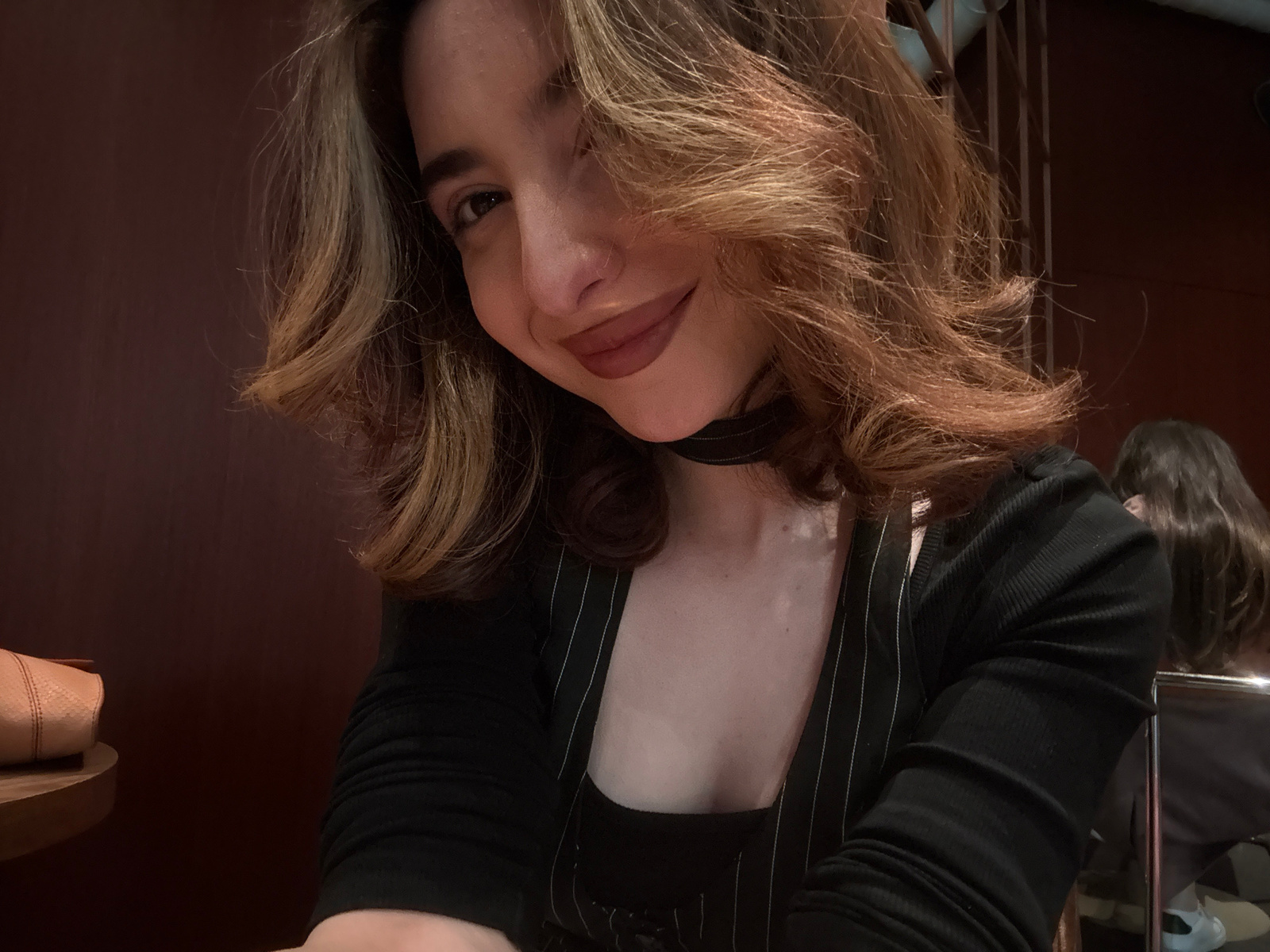 A close-up, portrait-oriented shot features a woman looking towards the camera with a subtle smile. Her head is tilted, and her voluminous, highlighted brown hair with blonde streaks frames her face a…read more