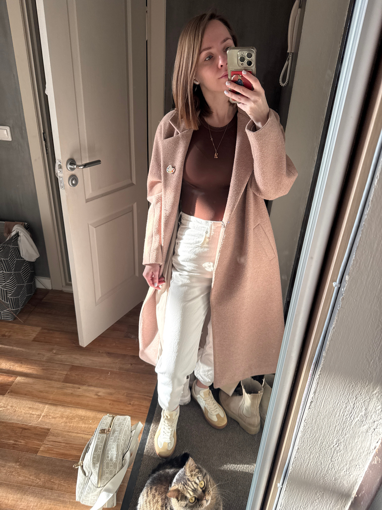 A woman takes a selfie in a full-length mirror. She is wearing a brown top, white pants, a light brown coat, and sneakers. A cat is partially visible on the floor to the right of the woman, along with…read more