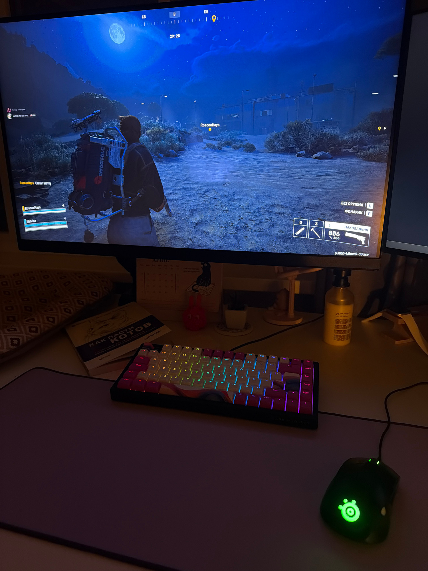 The image presents a close-up view of a desk setup, likely indoors, with a gaming theme. A computer monitor occupies the left side of the frame, displaying a video game scene set at night, featuring a…read more