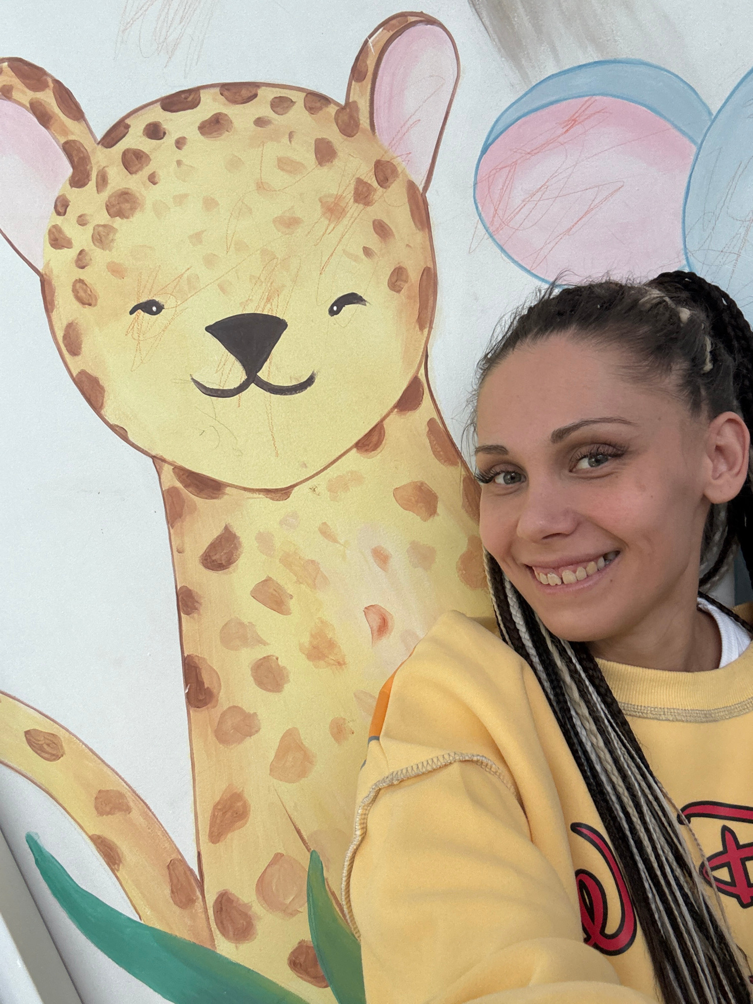 A woman with braided hair is smiling and posing in front of a mural. The mural features a cartoon cheetah lying down and two balloons above the cheetah's head, one pink and one blue. The woman is wearβ¦read more