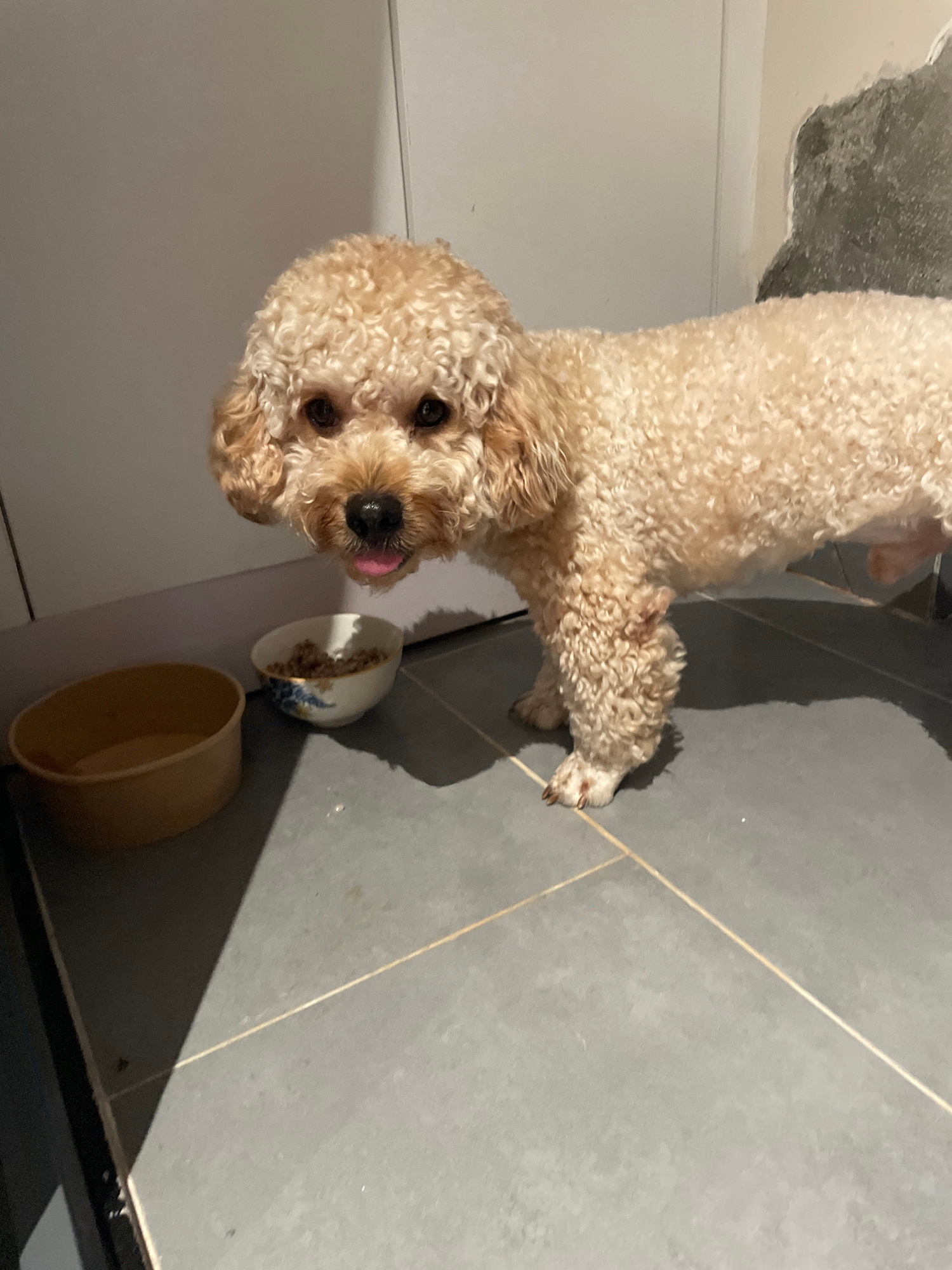 An indoor, overhead shot captures a light-colored, curly-haired dog, resembling a poodle or cavapoo, standing on a grey tiled floor. The dog, predominantly cream or light tan with darker ears and muzz…read more
