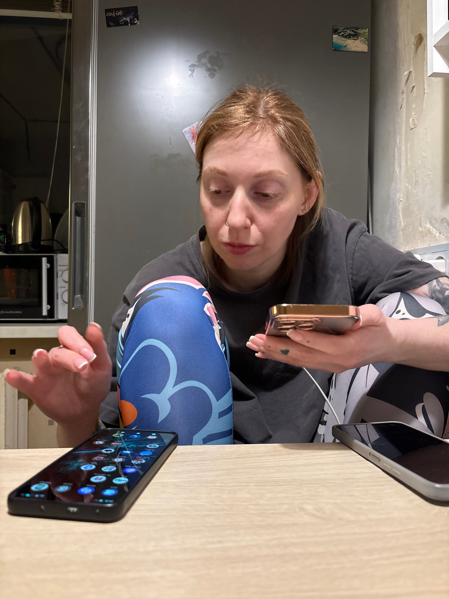 An indoor scene in Minsk, Belarus, depicts a female individual seated at a light-colored wooden table, engaged with multiple smartphones. The subject is a woman with light brown hair, a nose piercing…read more