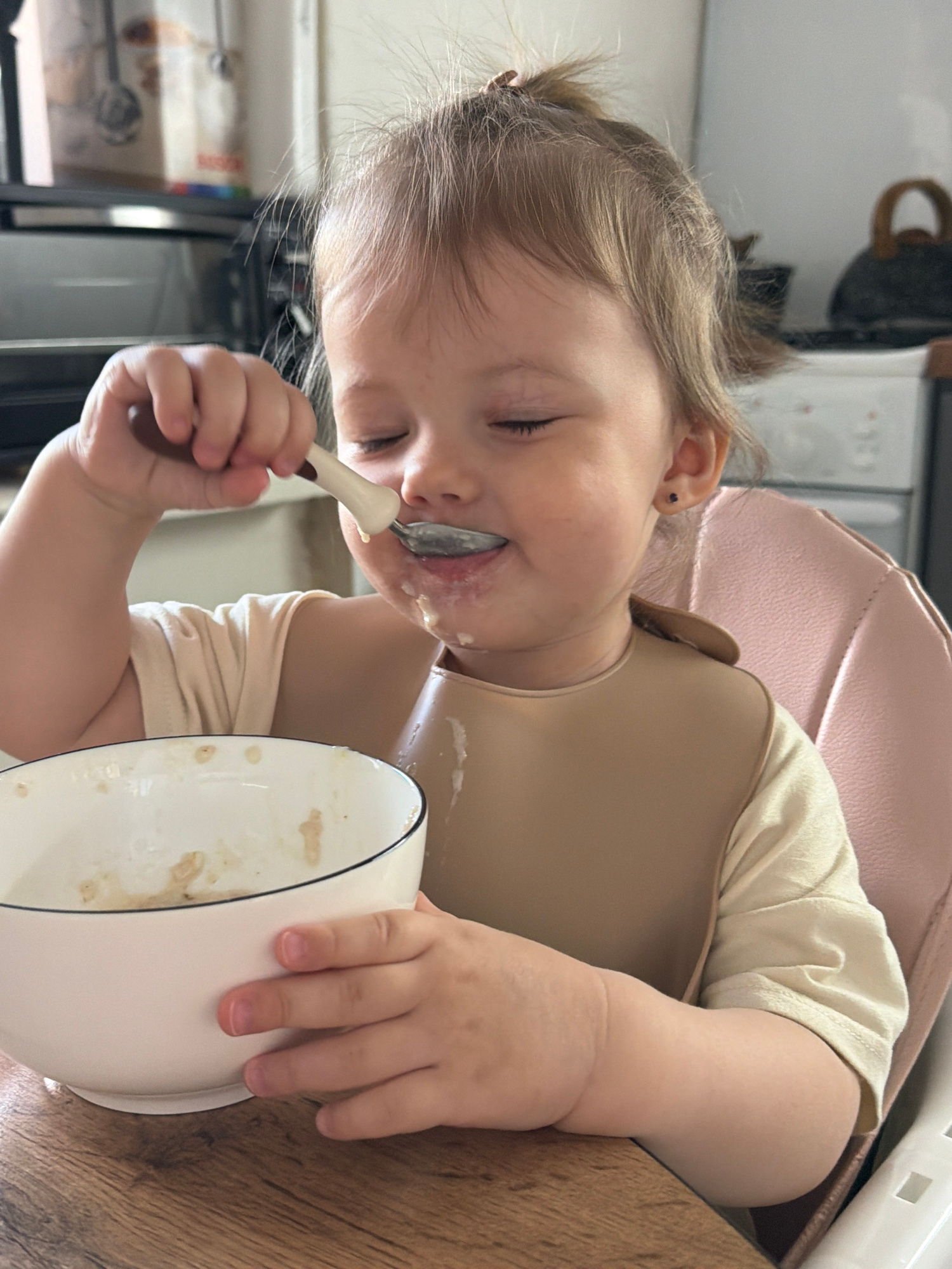 A young child with light brown hair is seated in a pink high chair, wearing a beige bib and a light-colored shirt. The child is holding a spoon in their right hand and is in the process of eating from…read more