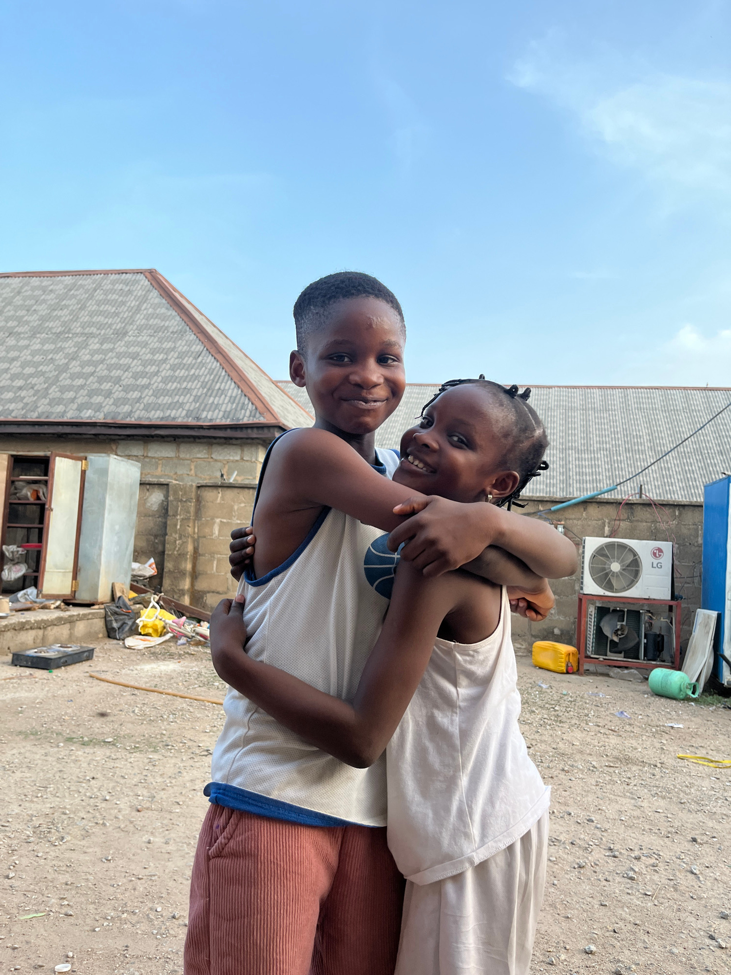 Two children, a boy and a girl, are embracing tightly. The boy is wearing a white tank top with blue trim and rust-colored corduroy pants. The girl is wearing a white top. An air conditioning unit is…read more