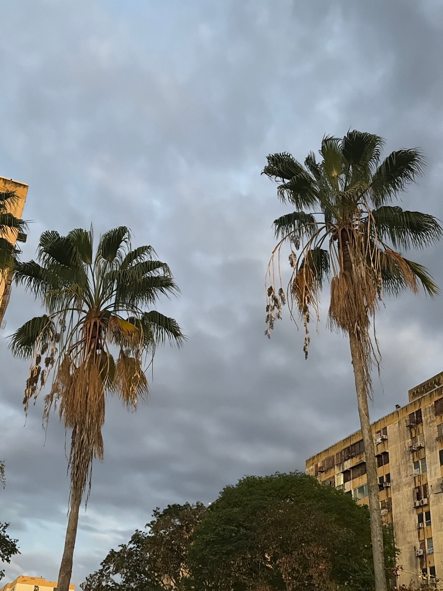 The image captures a low-angle view of two palm trees against an overcast sky, likely in Ciudad Guayana, Venezuela. The trees, positioned at opposite corners, are tall with green and brown fronds that…read more