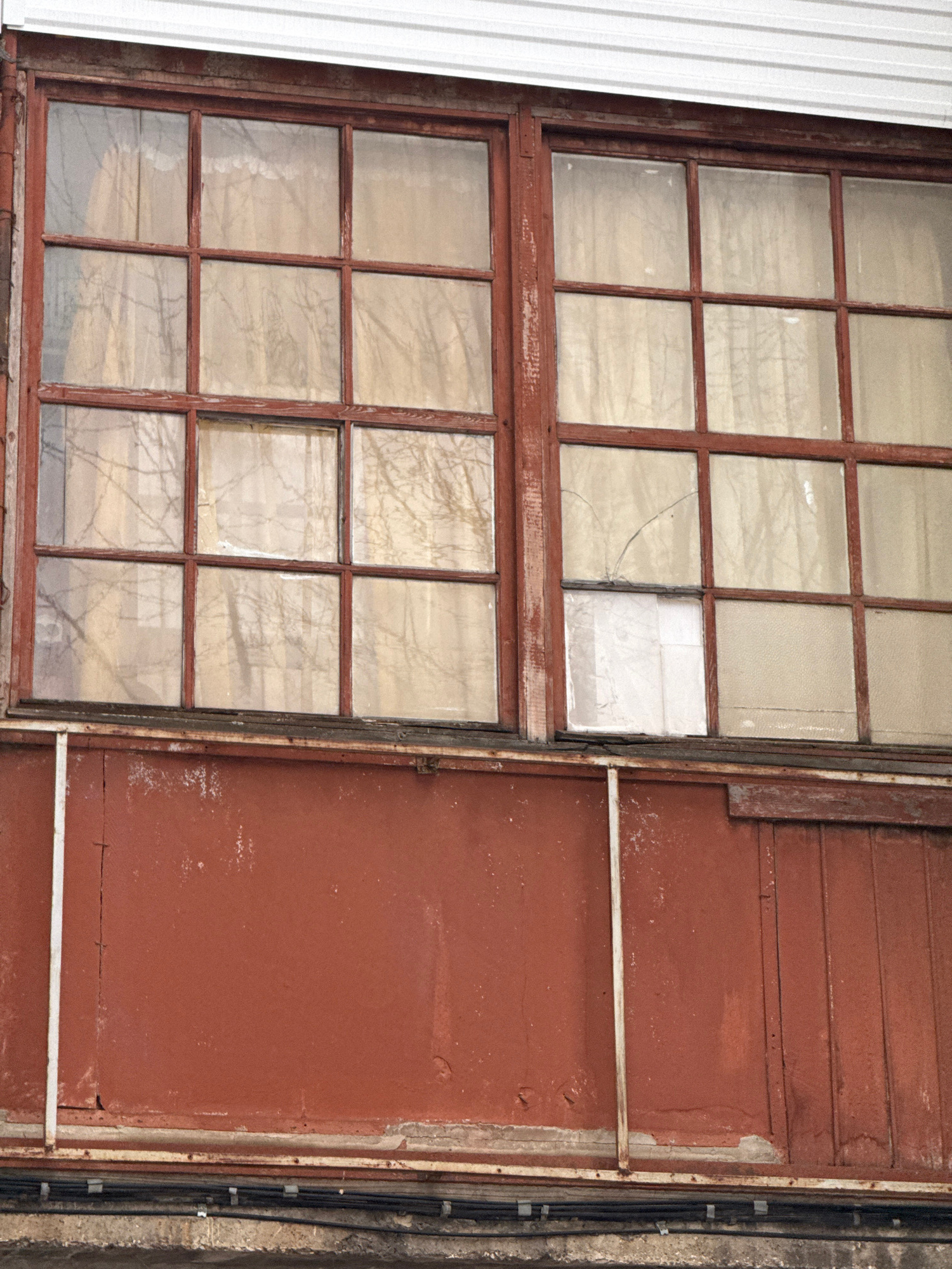 The image shows a weathered building exterior, likely in Perm, Russia, given the request. A large, divided-pane window dominates the left side of the frame, with a red-brown wooden frame. One pane is…read more