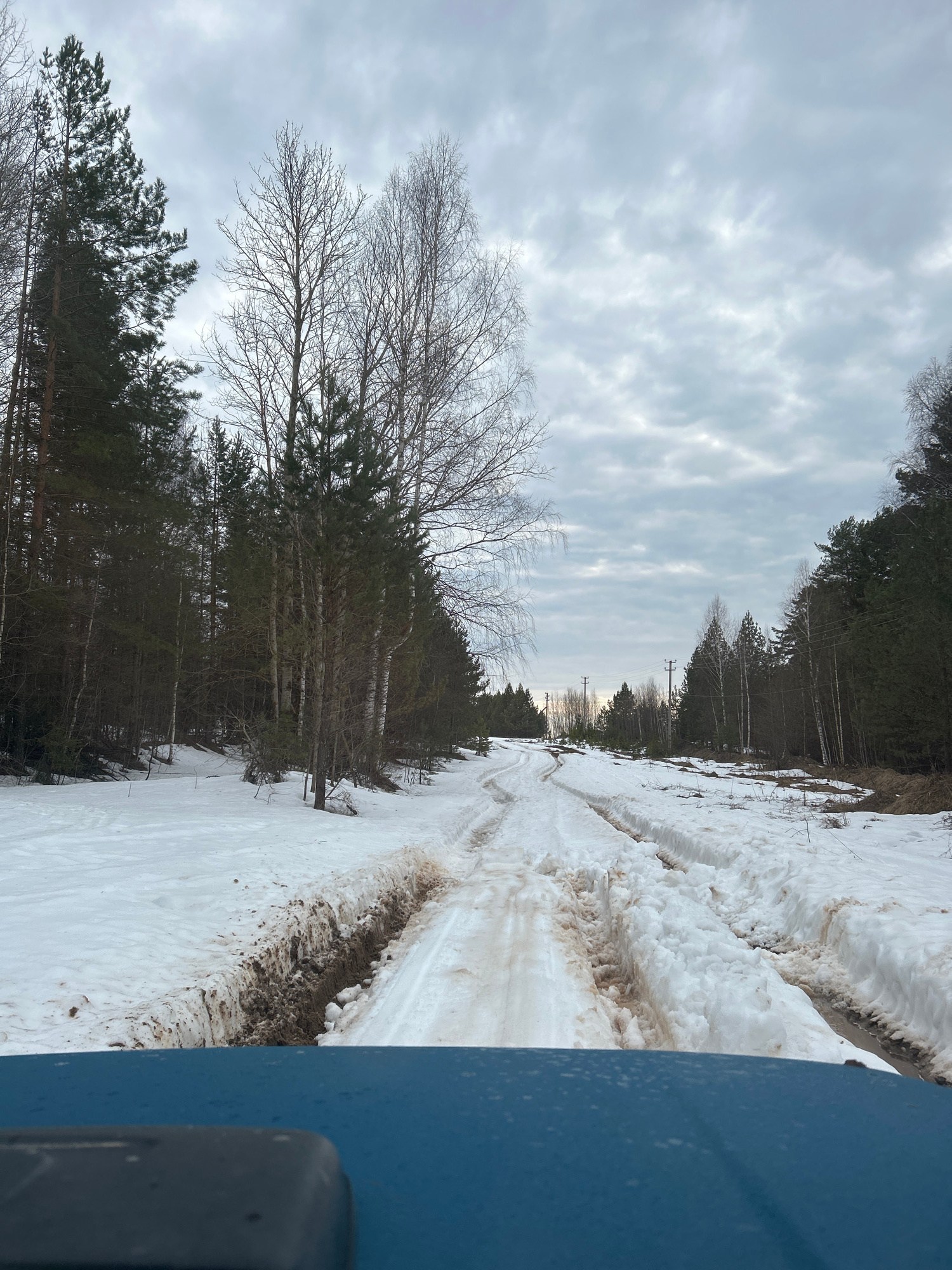 The scene is a snow-covered dirt road in a wooded area, under a cloudy sky. Tire tracks are visible in the snow on the road. A forest borders both sides of the road, with a mix of bare and coniferous…read more