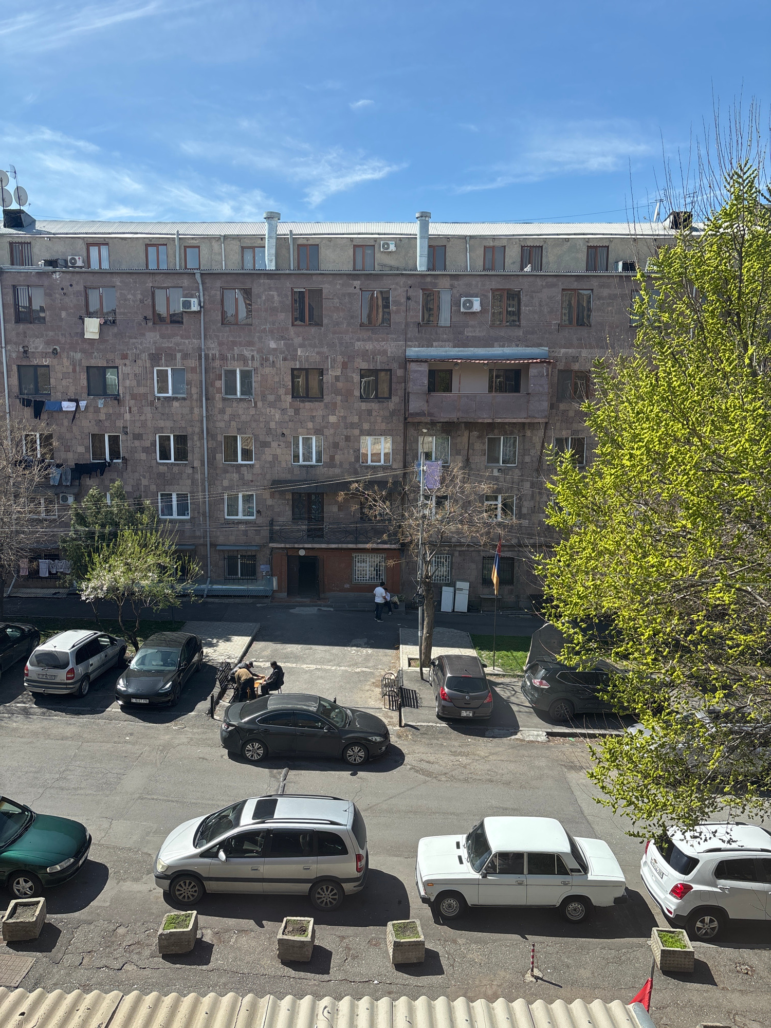 The image shows an exterior view of a multi-story residential building in Yerevan, Armenia. The building, constructed of a brown, rough-hewn stone-like material, features numerous windows and air condβ¦read more