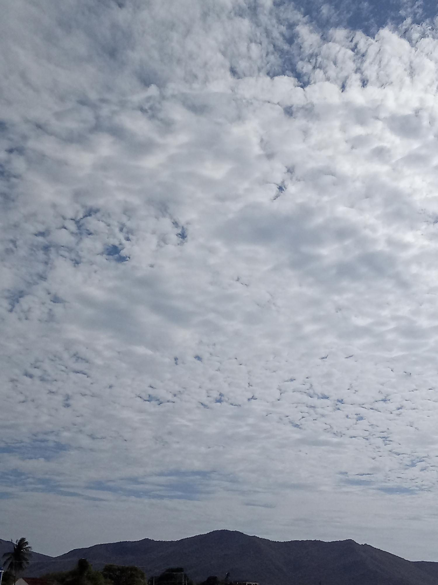 The image shows a sky filled with altocumulus clouds above the mountainous landscape of Juan Griego, Venezuela. At the base of the mountains, there are visible trees, buildings, and a palm tree to the…read more