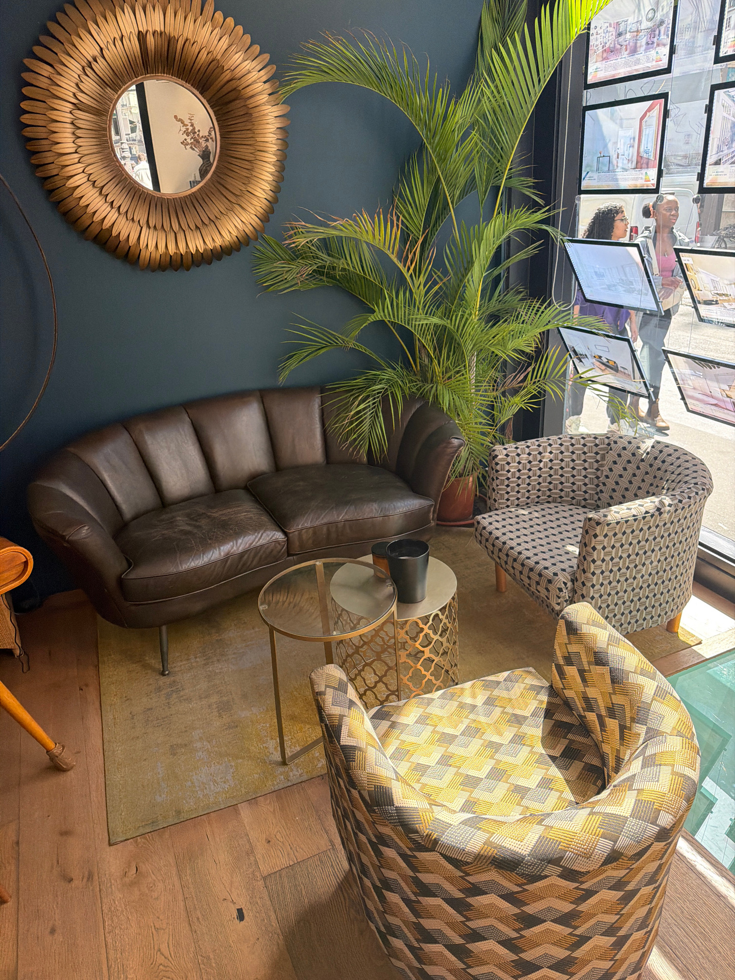 The scene is an interior shot with an oblique, high-angle perspective, likely taken from above looking down into the space. A deep blue wall is partially visible on the left, adorned with a round, orn…read more