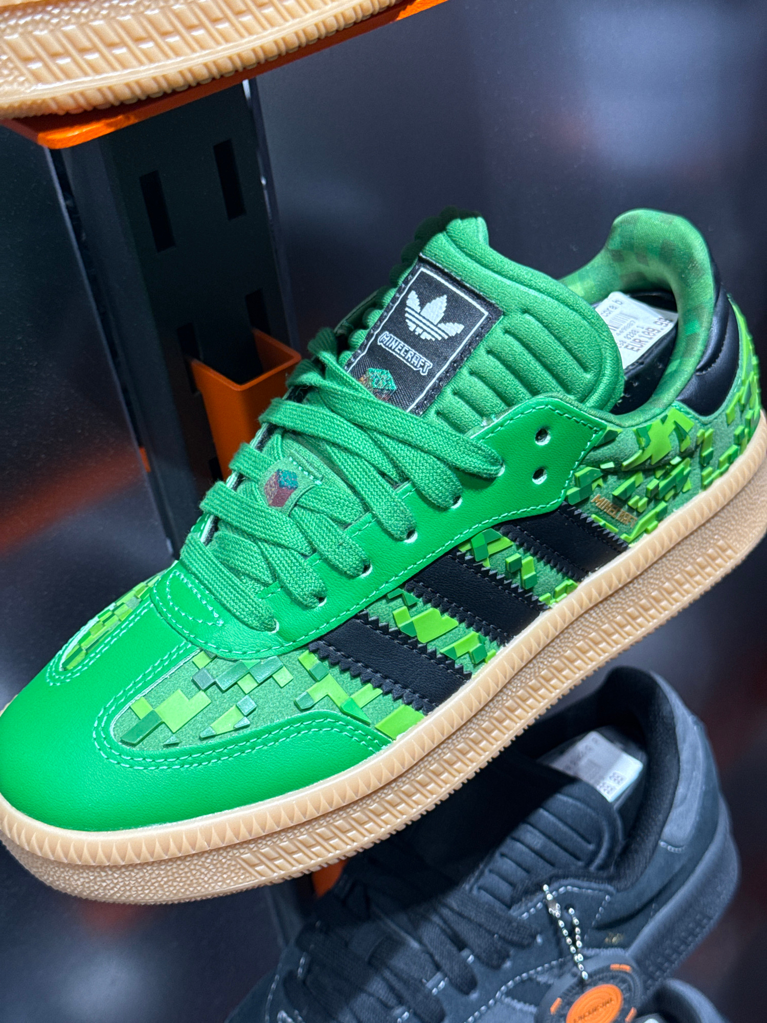 The image shows a pair of green Adidas Samba sneakers with a Minecraft theme. The shoes feature pixelated green patterns, black Adidas stripes, and a gum sole. The tongue of the shoe has an Adidas log…read more