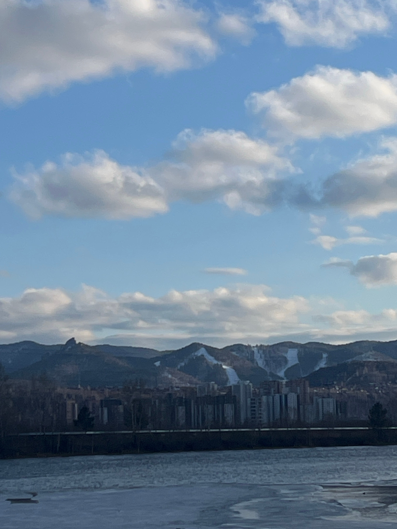 The image displays a panoramic winter or early spring landscape, presented in a portrait orientation that, when rotated 90 degrees clockwise, reveals a broad horizontal vista. The top two-thirds of th…read more
