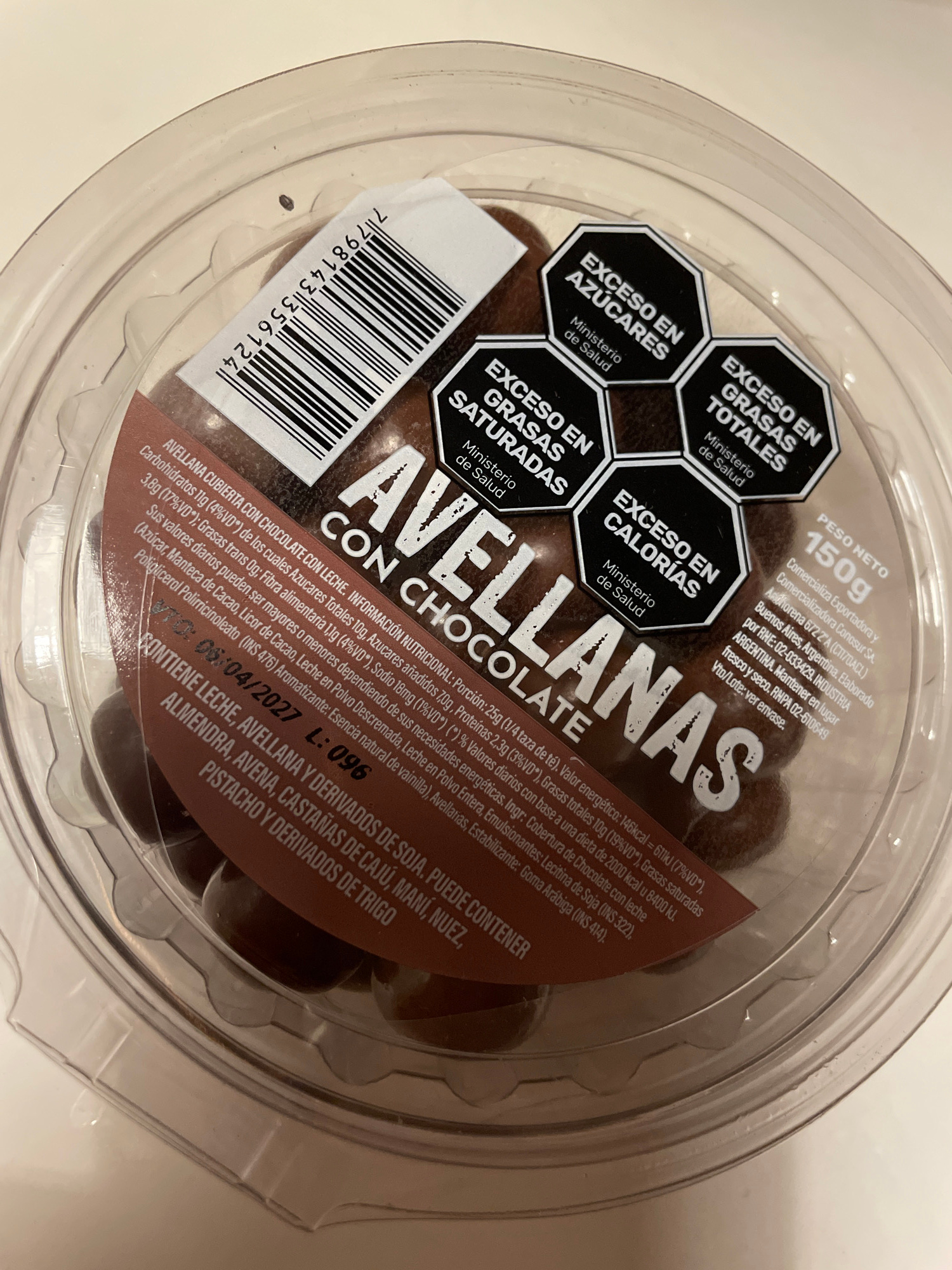 A product is displayed, a transparent plastic container filled with chocolate-covered hazelnuts, labeled "AVELLANAS CON CHOCOLATE" (Hazelnuts with Chocolate). The label includes four warning signs in…read more