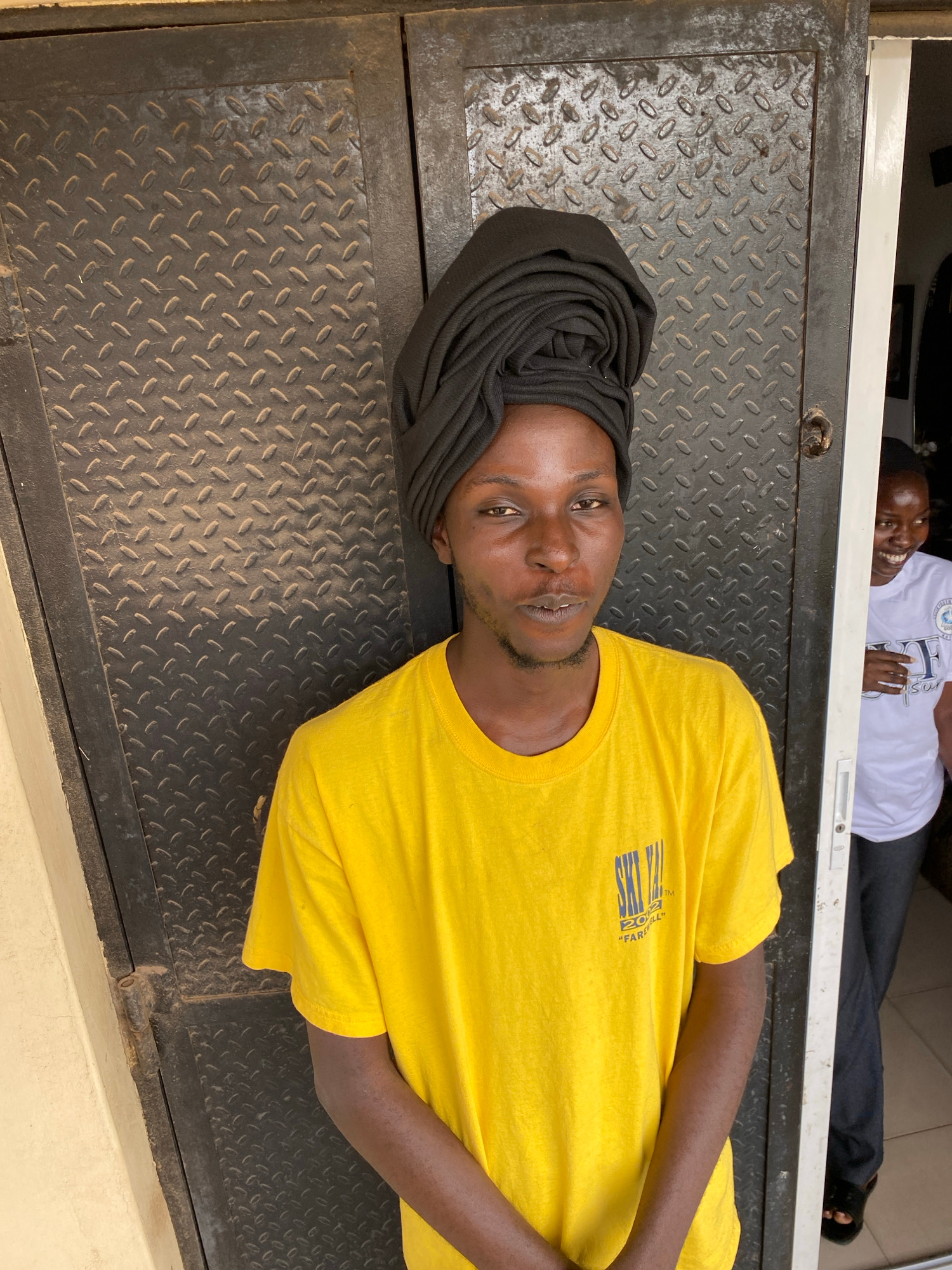 Two men are lying on a diamond-plated metal surface. One man is wearing a yellow t-shirt and a dark-colored head covering. The second man is wearing a white t-shirt. The location is Jos, Nigeria.