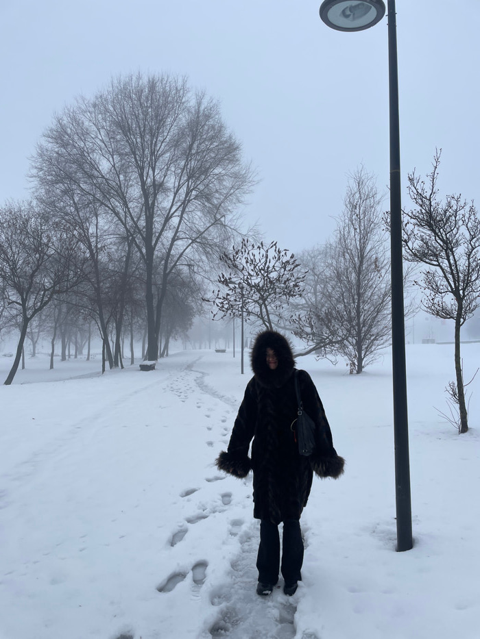 The image portrays a lone individual walking through a snow-covered public park in Belgrade, Serbia, under overcast and foggy winter conditions. The ground is uniformly covered in white snow, with a d…read more