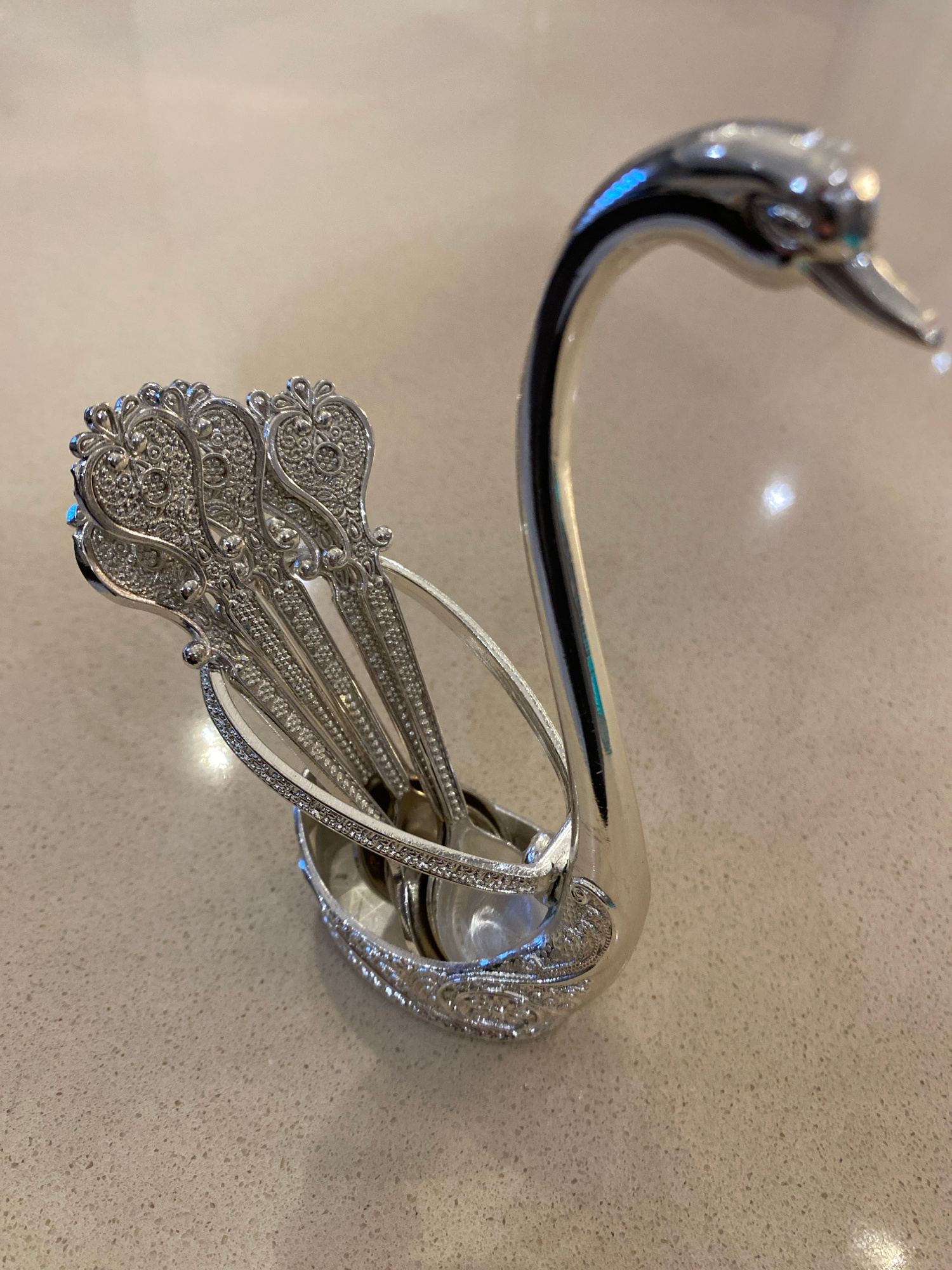 The image shows a silver-colored, decorative wall hook, possibly made of metal, mounted on a light-colored, speckled countertop or wall surface. The hook's design includes a curved, swan-like head and…read more