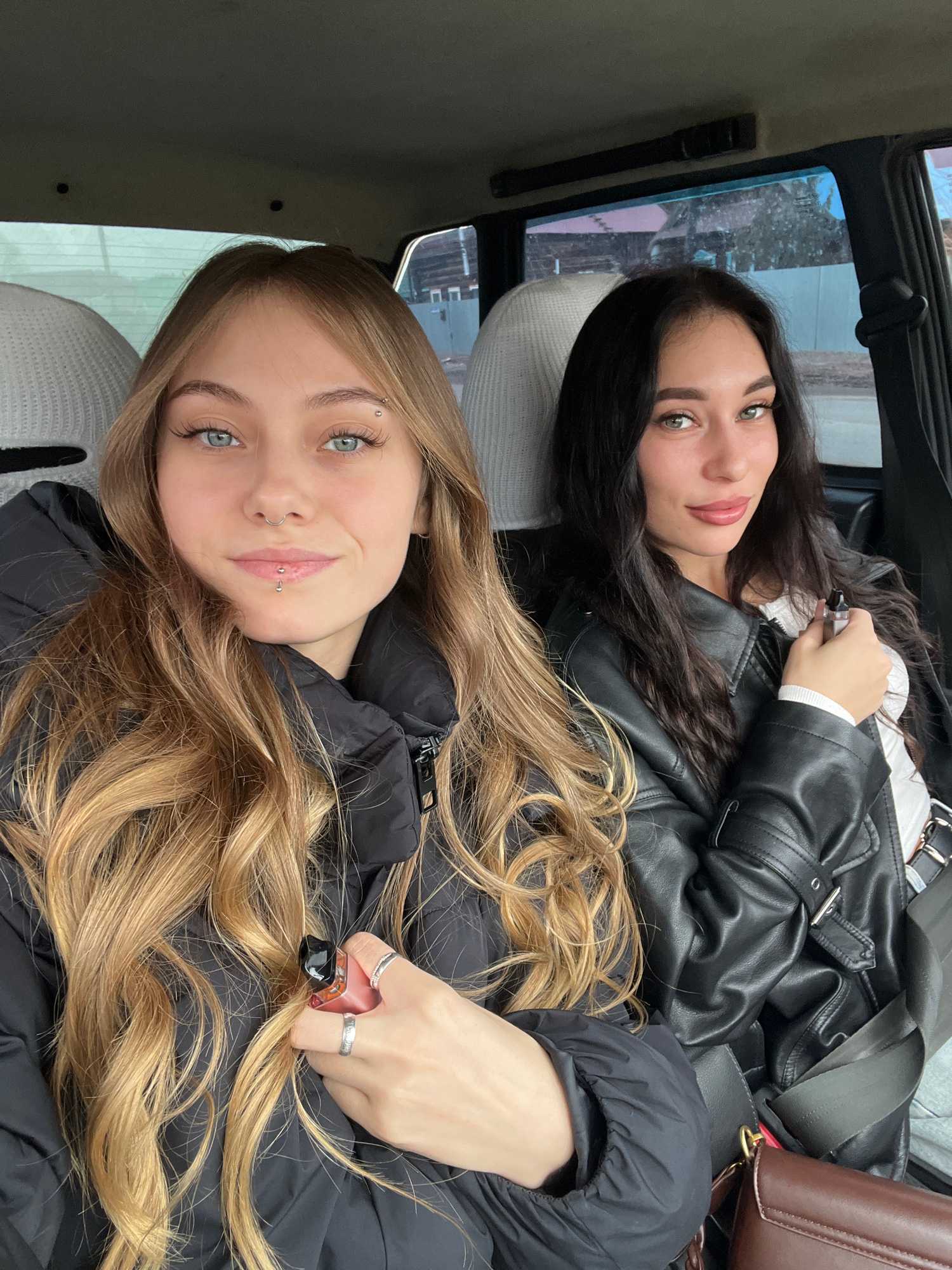 Two young women are positioned in what appears to be the back of a vehicle. The woman in the foreground has long blonde, wavy hair and facial piercings on her eyebrow, nose, and lip. She is wearing a…read more