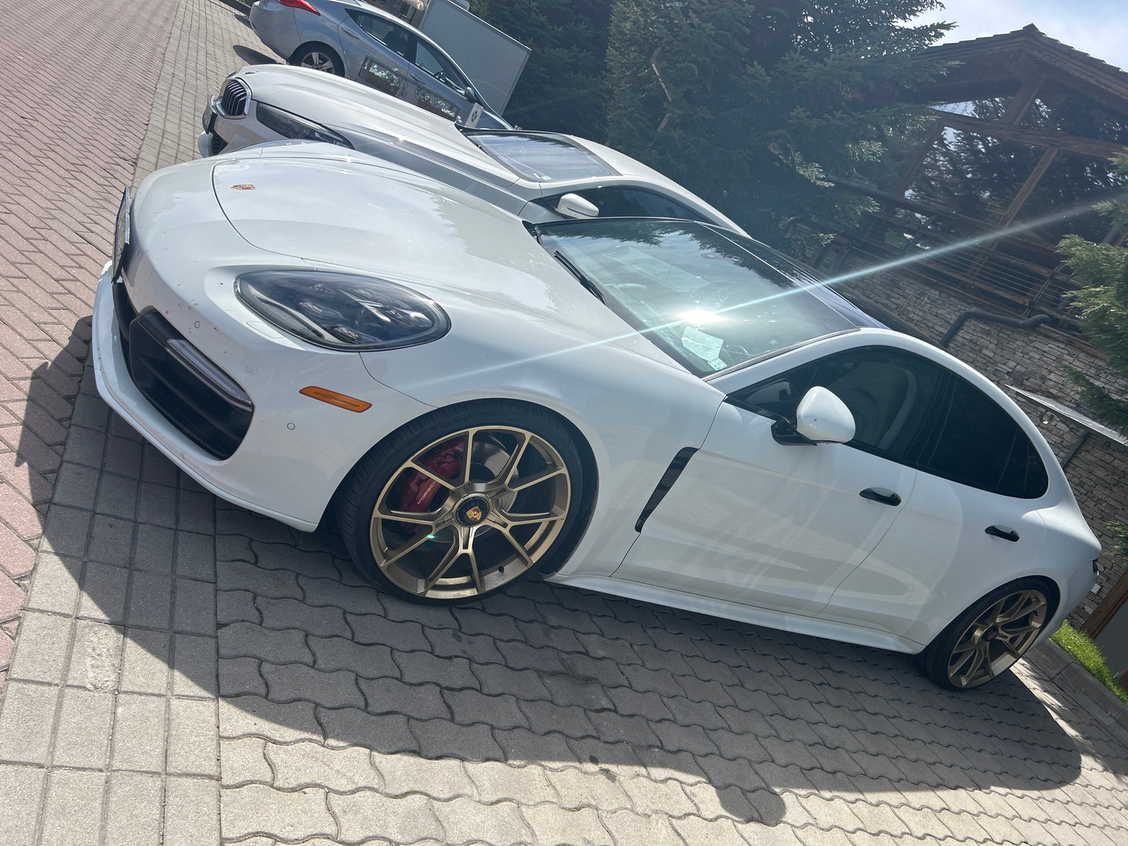 A white Porsche car is prominently featured, parked on a patterned paved surface under bright sunlight in Razlog, Bulgaria. The car is equipped with distinctive gold-colored, multi-spoke alloy wheels,…read more