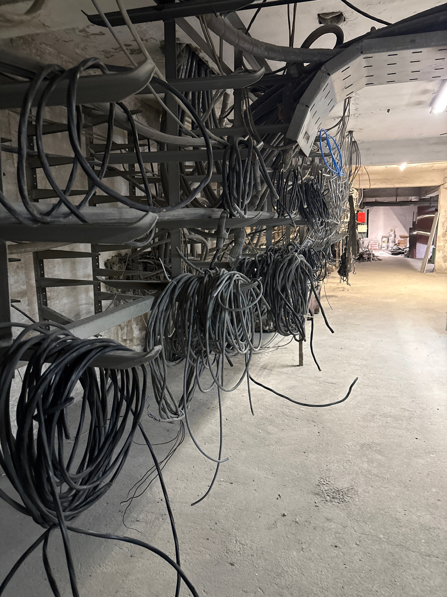The image depicts a confined space, likely a corridor or utility area, in Mirkovo, Bulgaria. Rows of metal racking or cable trays are arranged along the corridor, filled with densely coiled black cabl…read more
