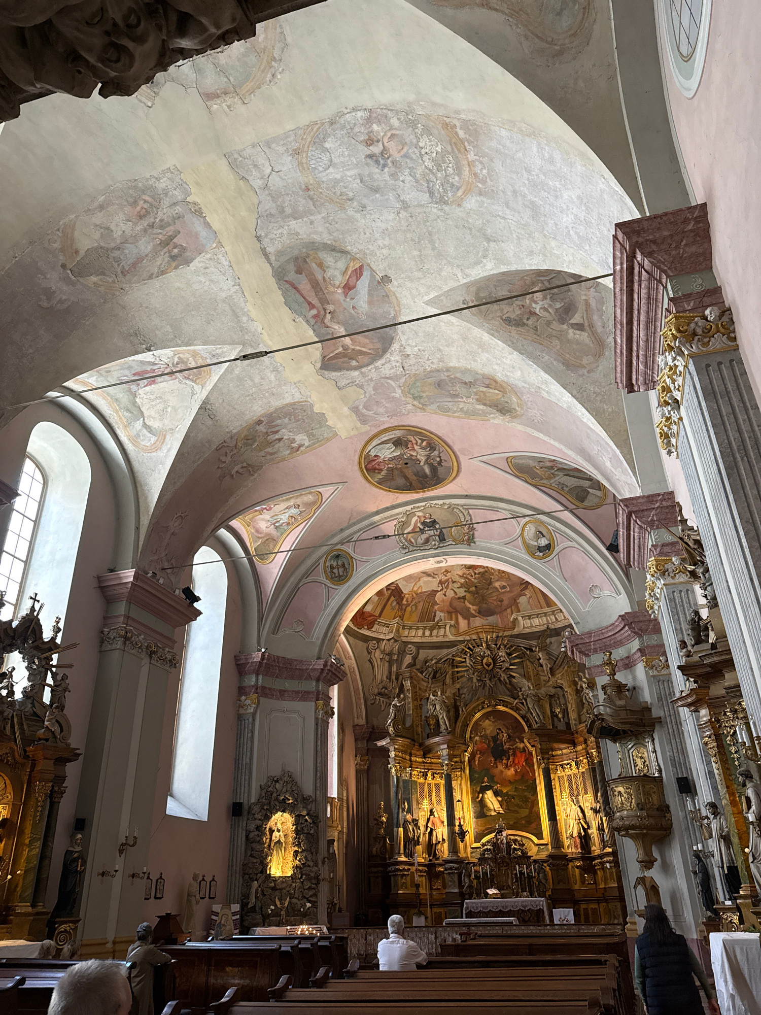 This image depicts the interior of the Saint Anne Church in Budapest, Hungary. The view is angled upwards, capturing the ornate, fresco-covered ceiling. The frescoes depict religious scenes and figure…read more