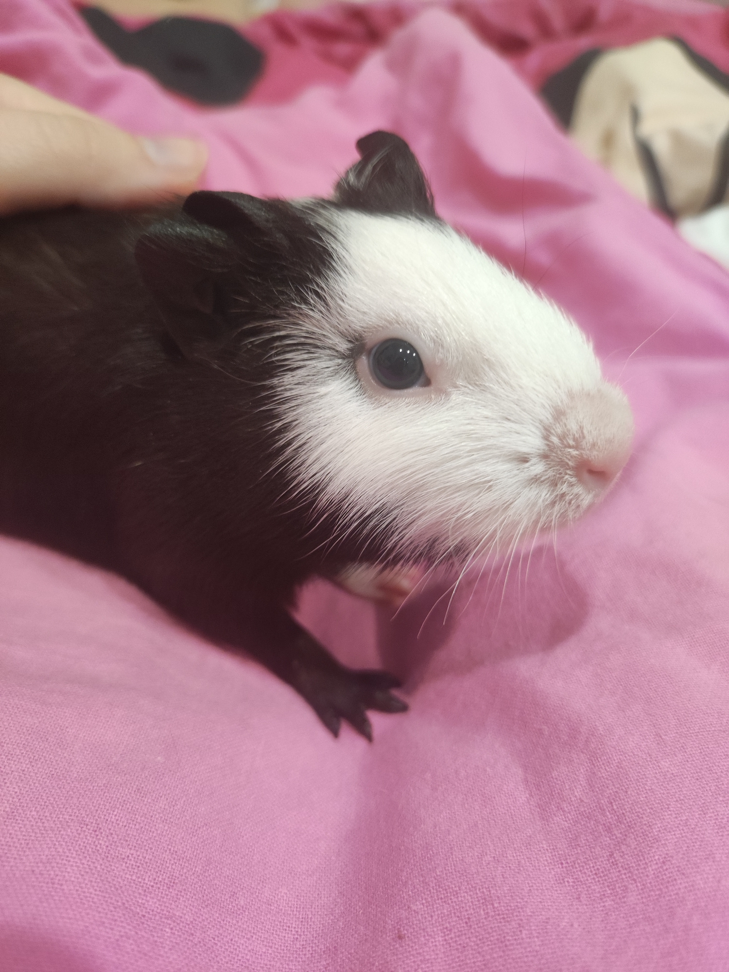 A close-up shot shows a guinea pig on a pink surface. The guinea pig has black fur on its head and body, and white fur on its face. A hand is gently touching its head. The background is slightly out o…read more