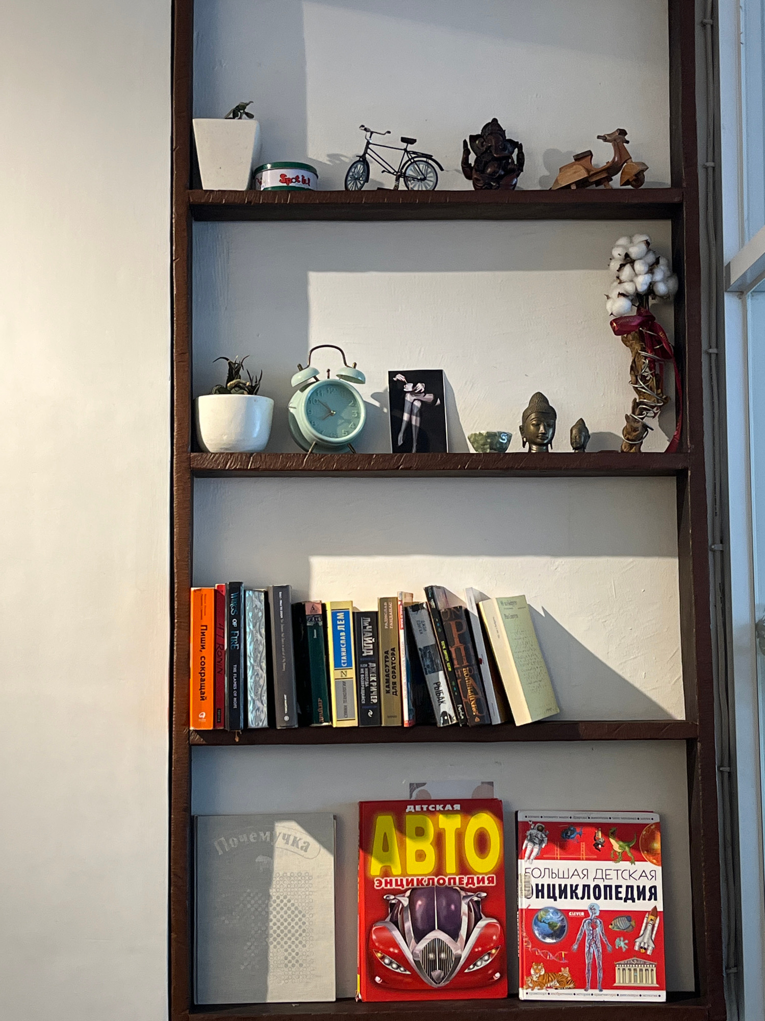 The image shows a wooden shelving unit against a white wall, likely indoors in Kuta Selatan, Indonesia. The unit contains various items arranged in three distinct sections. On the left, there are woo…read more