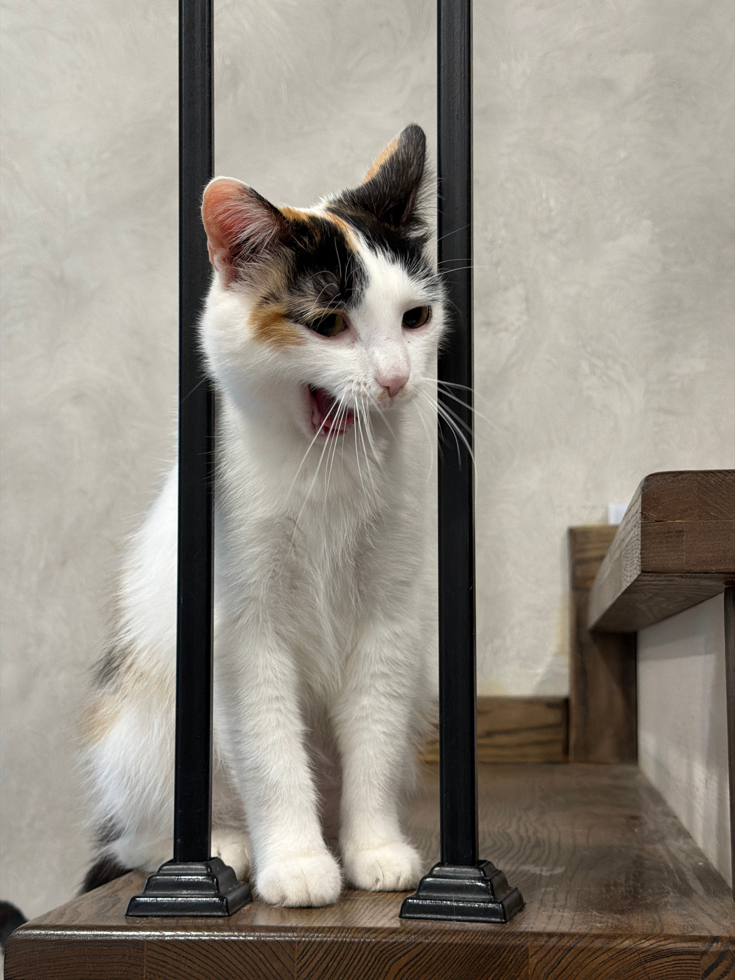 A calico cat is seen extending its body horizontally between black metal railing supports, as part of a wooden structure, in what appears to be a residential interior setting. The cat's mouth is open,…read more