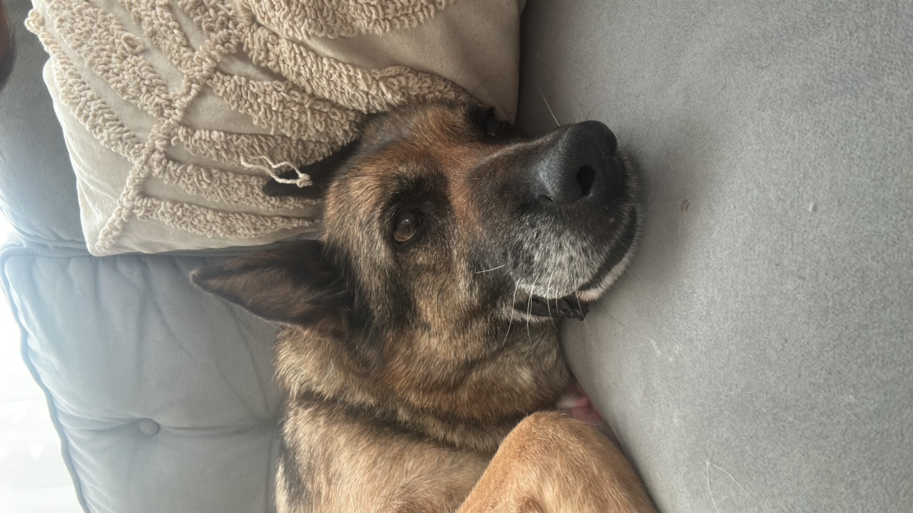 The image depicts a medium-sized dog, possibly a German Shepherd mix, lying on a gray surface, likely a couch. The dog is on its back, with its head turned to the side, revealing its teeth in a grimac…read more