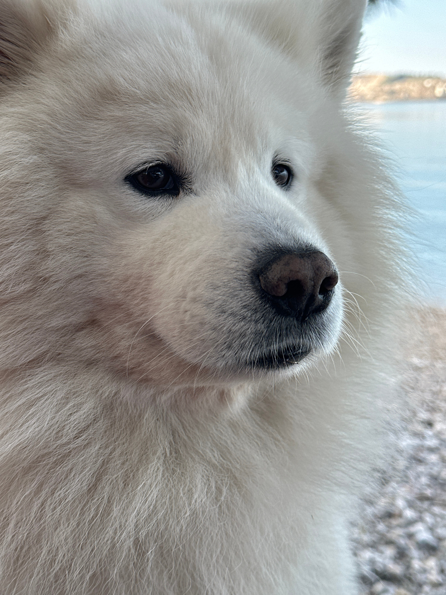 Close-up view of a white, fluffy Samoyed dog lying on its back. The dog's nose is centrally located in the image and in focus, with its eyes visible on either side. The background appears to be a blur…read more