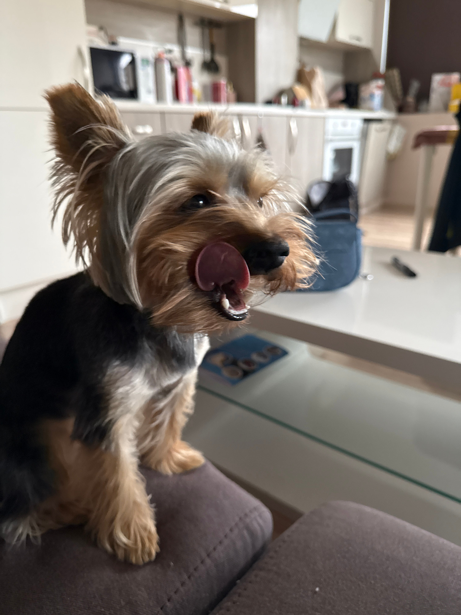 A Yorkshire Terrier is positioned on a gray upholstered surface, possibly a couch or chair. The dog is facing the camera with its tongue out. The background is a blurry, bright interior space resembling a kitchen. There are cabinets, drawers, and appliances visible in the background, including a microwave. The scene is likely indoors. There is no information available to determine if this is in the city of Varna, Bulgaria. | Open Wire