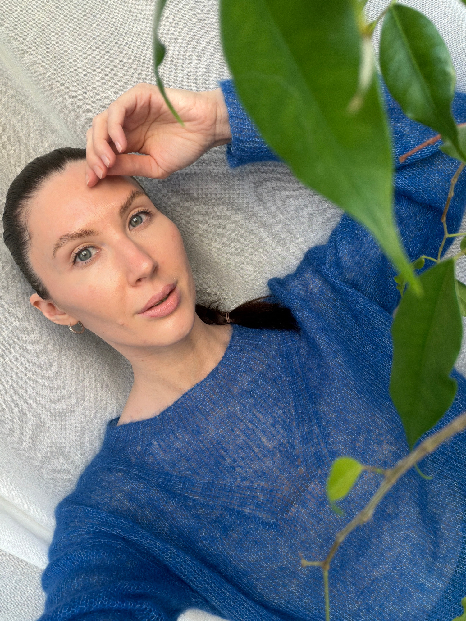 A woman lies on a light grey/white linen surface. She is wearing a blue, loosely woven sweater. Her dark hair is partially pulled back. She looks up at the camera, her right hand resting near her face…read more