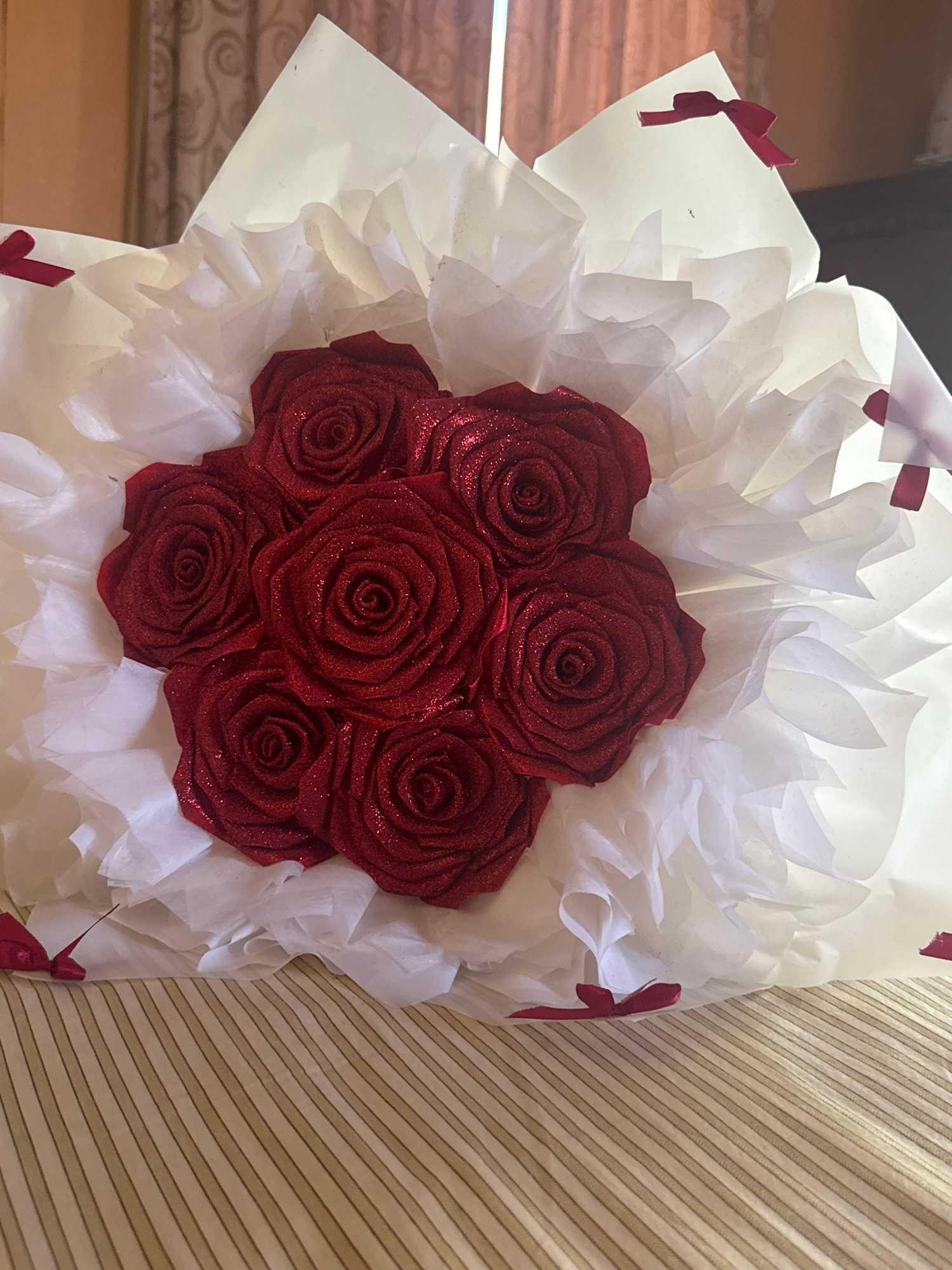 A bouquet of seven red, glittery roses is displayed in a white, crinkled paper wrapping adorned with small red ribbon accents. The bouquet is situated indoors, close to a surface with a striped patter…read more
