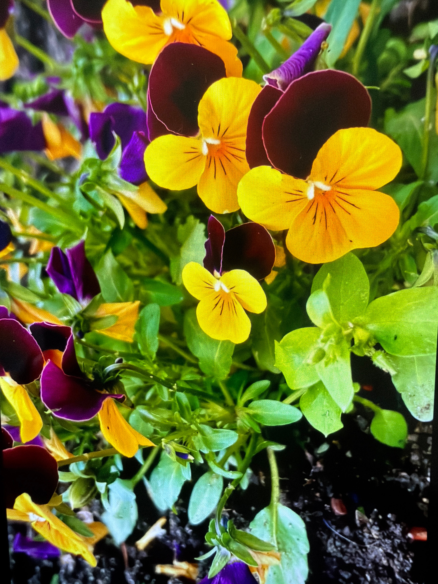 The image shows a close-up of a vibrant flowerbed with pansies in various colors. Predominantly, the pansies exhibit a striking combination of yellow and dark burgundy petals, with some showcasing yel…read more