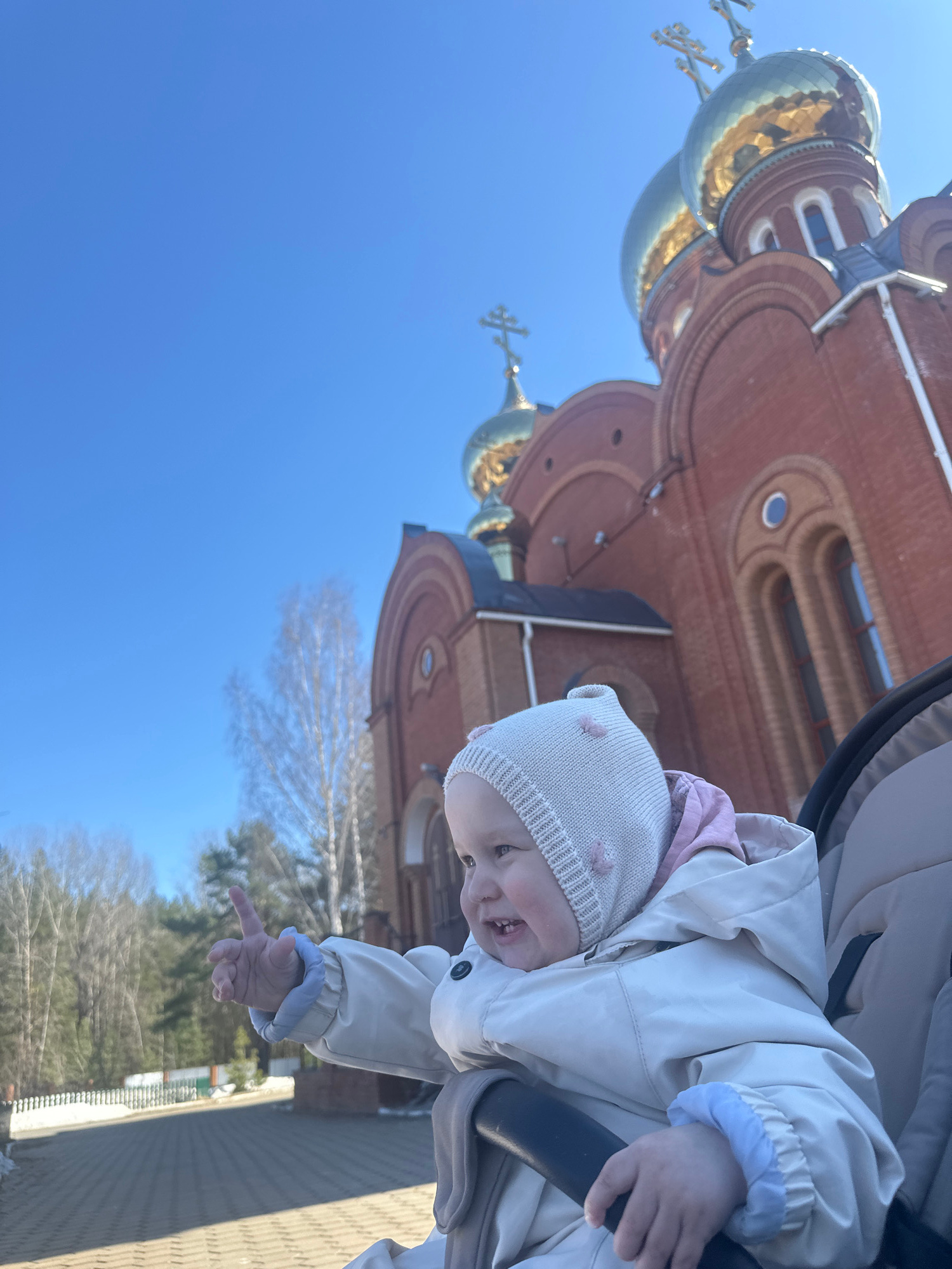 A baby in a white hat and beige jacket is in a stroller in front of the Alexander Nevsky Cathedral in Chaikovsky, Russia. The cathedral is red brick with golden domes topped with crosses. The sky is bβ¦read more