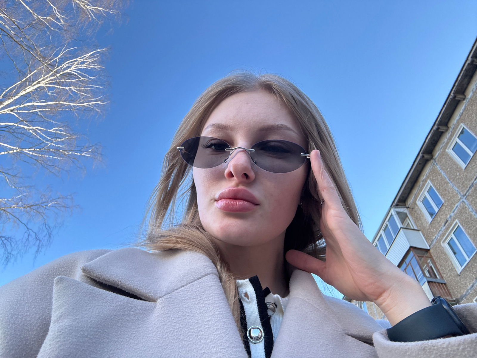 A selfie taken from a low angle shows a blonde woman wearing sunglasses and a light-colored coat with a black and white trim. The background consists of a clear blue sky, bare tree branches, and a mul…read more