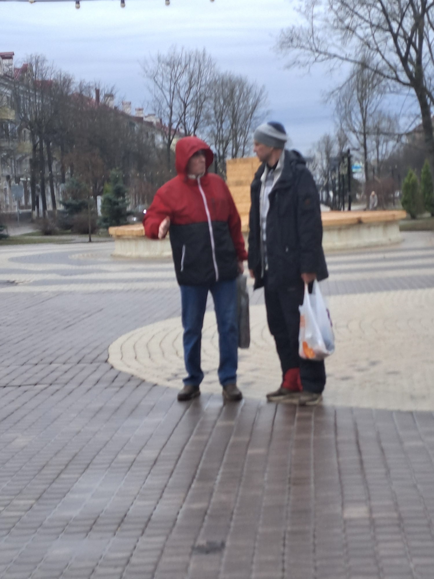 A photograph depicts two people walking on a brick-paved surface. The individual closest to the foreground is wearing a red hooded jacket, blue jeans, and dark shoes. The second person is behind them, wearing a black jacket, grey hat, and dark shoes, and is carrying a plastic bag. Both are walking in the same direction. The background features bare trees suggesting a fall or winter season. In the distance, building structures and a park can be seen. The location is Elektrostal, Russia. | Open Wire