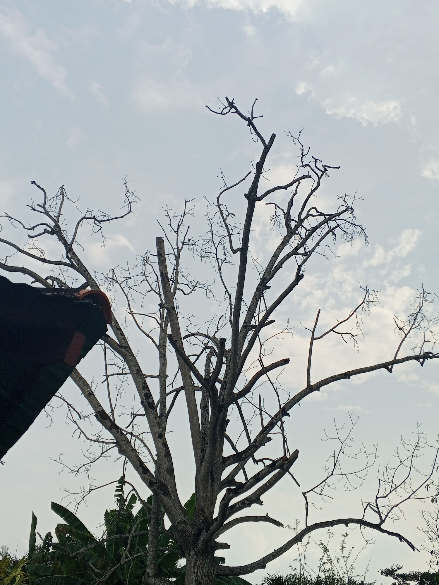 The image shows a large, mostly leafless tree against a cloudy sky. Some green foliage, possibly banana plants, is visible at the base of the tree. A portion of a dark-colored roof is present in the l…read more
