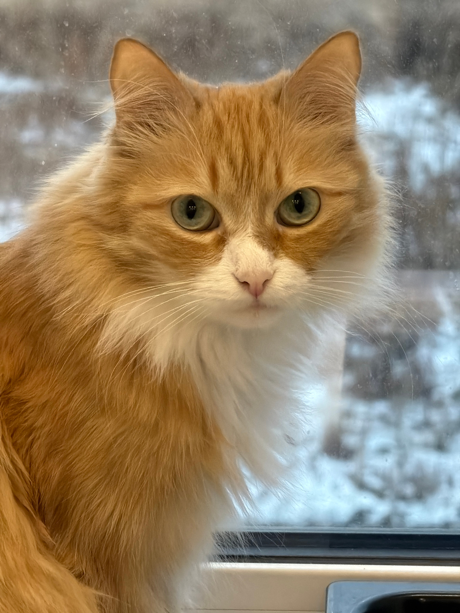 An orange and white long-haired cat with green eyes is looking directly at the camera, tilting its head slightly to the left. The cat is indoors, close to a window. The background visible through the…read more