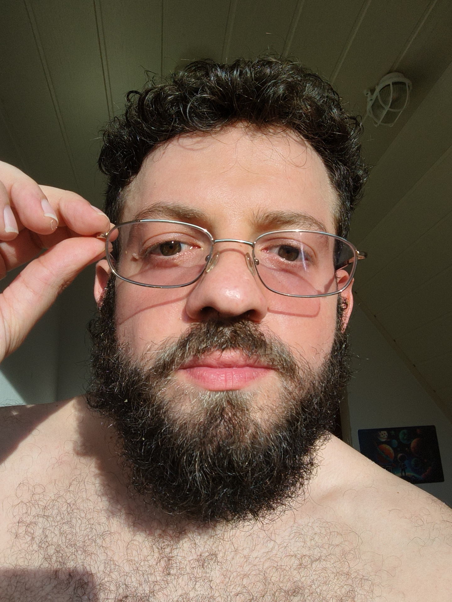 A close-up, upward-angled selfie of a man with a dark curly hair and a full, dark beard, wearing rimless rectangular glasses. He is holding the right side of the glasses frame with his left hand. His…read more
