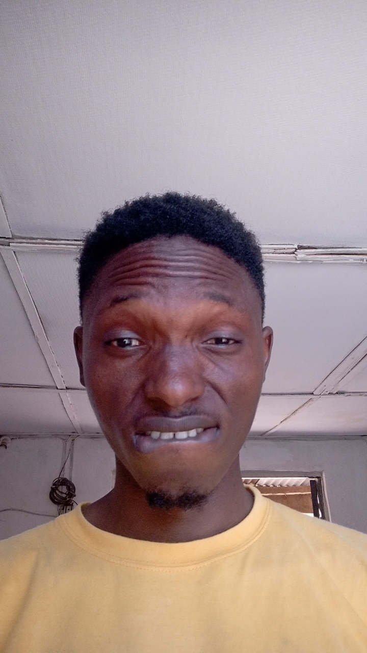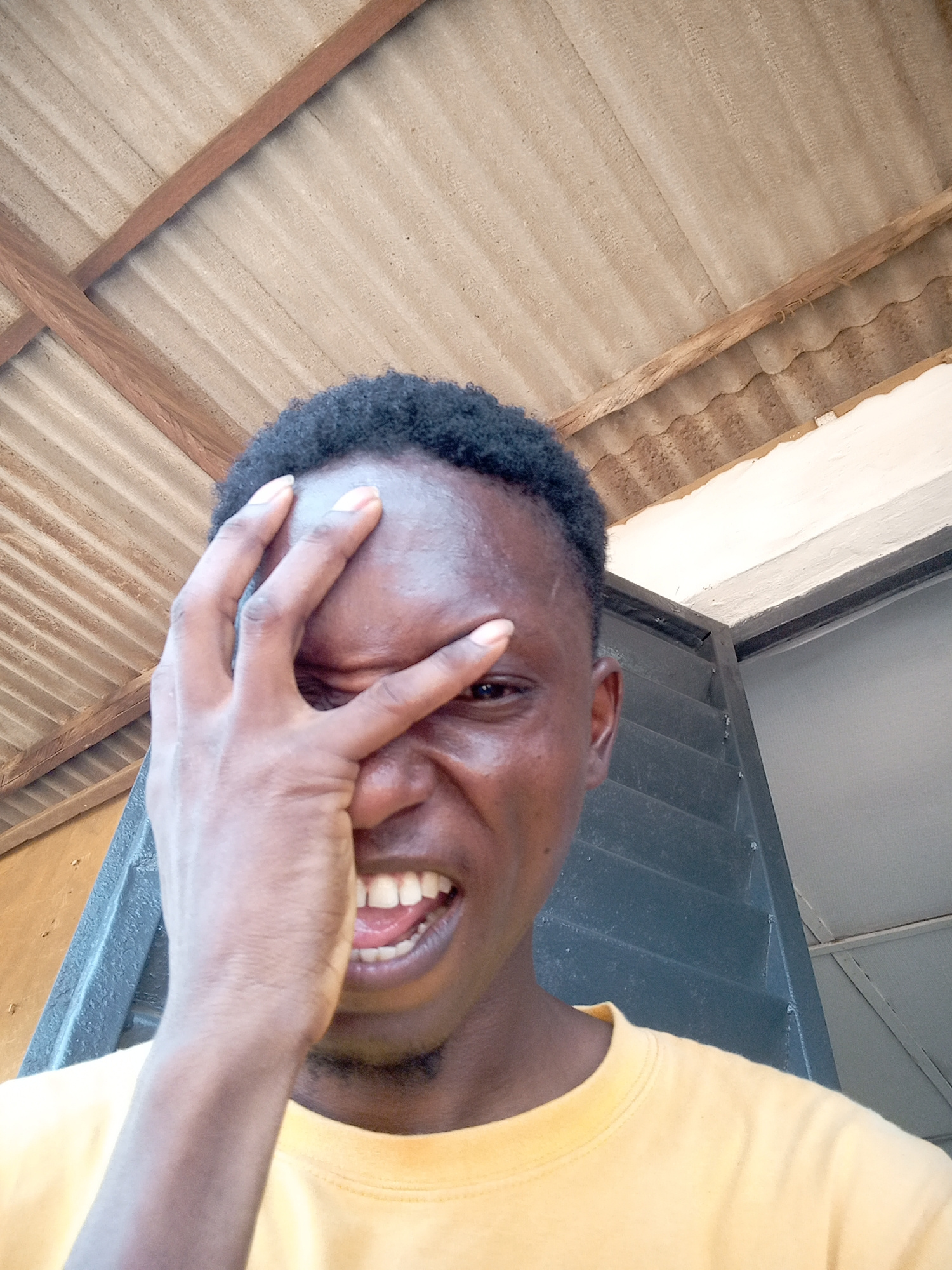 A young man, appearing to be of African descent, is captured in a close-up, upward-angled shot. He has short, dark, curly hair and is wearing a plain yellow short-sleeved shirt. His right hand is rais…read more