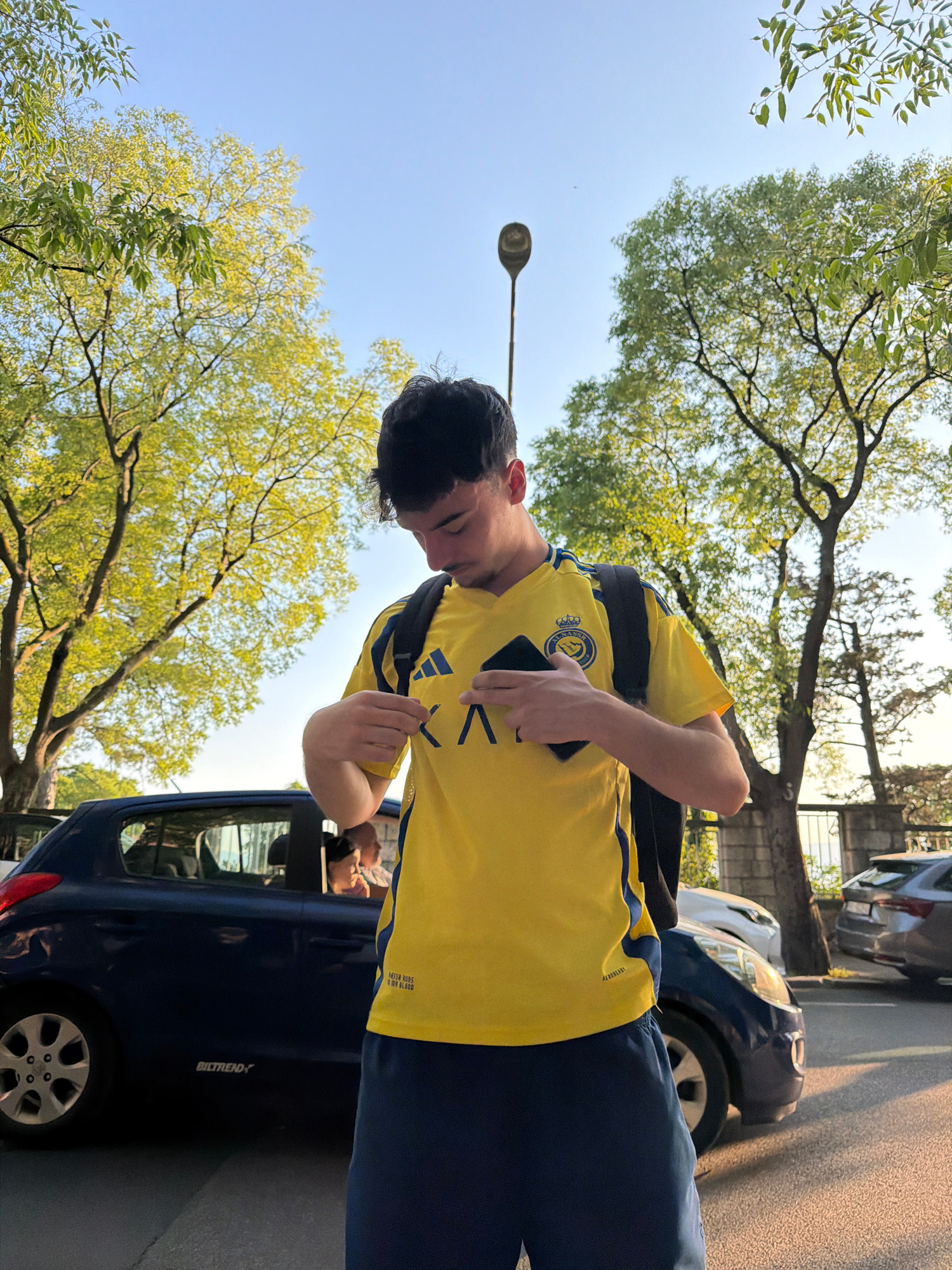 A young man stands near a blue car on an urban street, possibly in Grad Rijeka, Croatia, judging by the car registration plate prefix "RI". He is wearing a yellow and blue jersey with dark blue pants.…read more