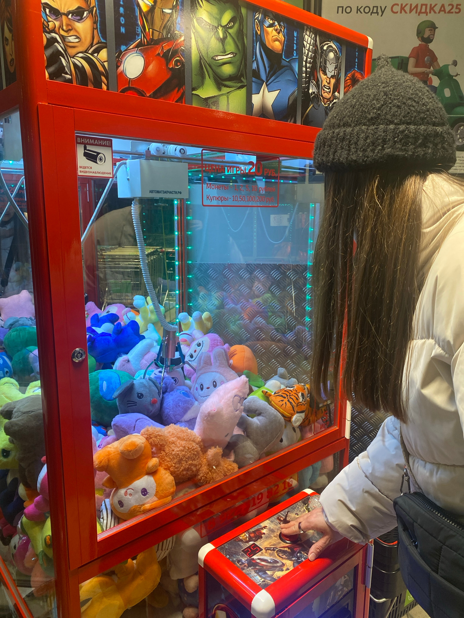 The image depicts a person wearing a gray knit hat and a white puffy jacket, playing a claw machine in Votkinsk, Russia. The machine is filled with plush toys, mostly in pastel colors, including a tig…read more