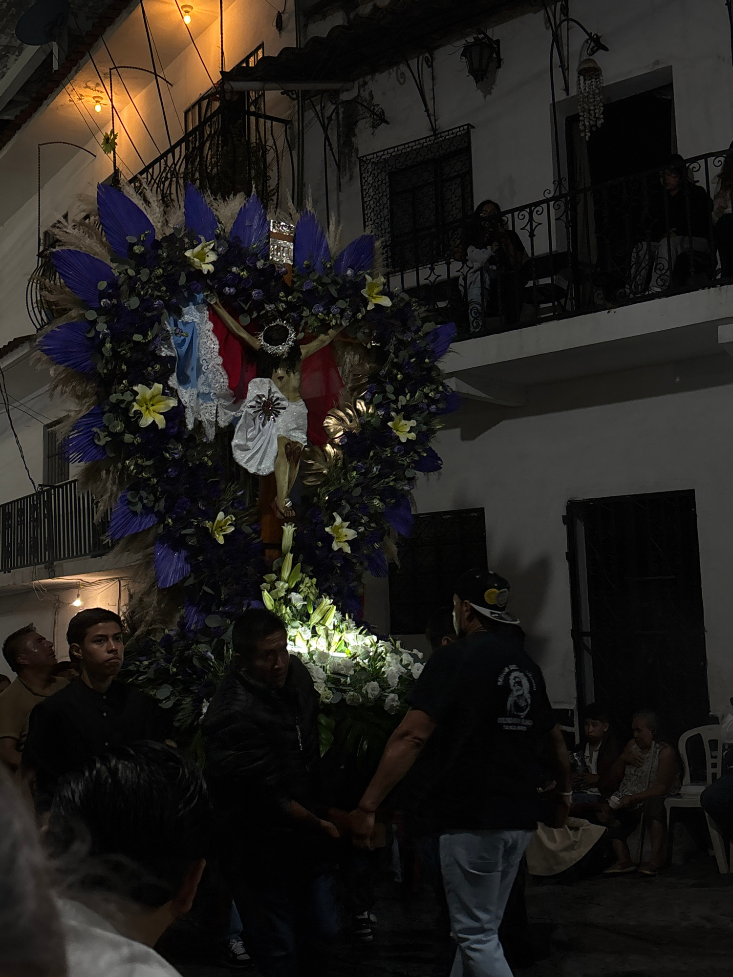 A night scene in Taxco, Mexico, shows a religious procession carrying a floral-decorated float depicting Jesus on the cross. The float is carried by men in dark clothing. Spectators watch from the strβ¦read more