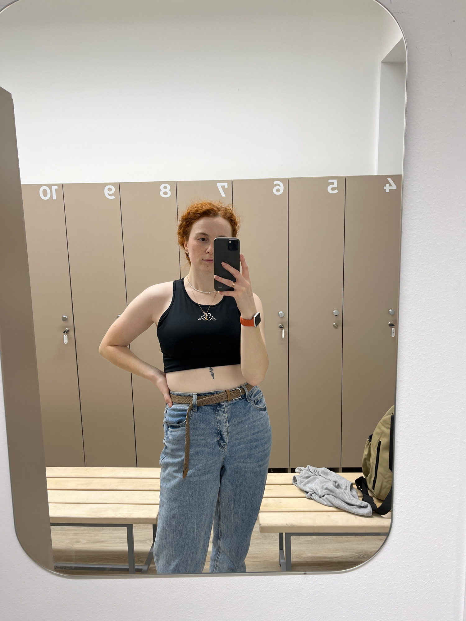 A person is visible in a mirrored reflection, seemingly in a locker room or changing area, likely in the city of Chaikovsky, Russia, based on possible context. The individual is holding a mobile phone…read more