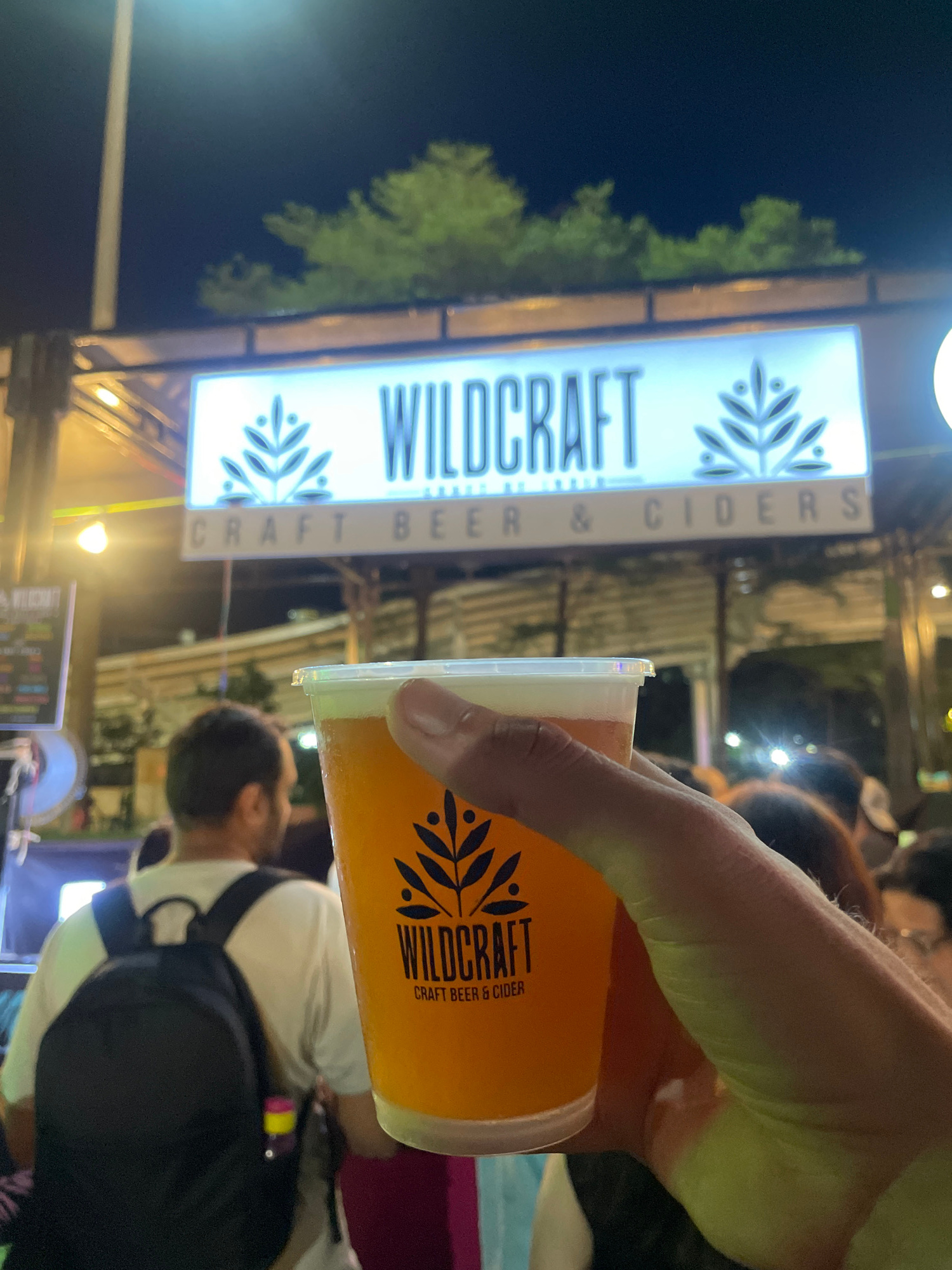 Here's a detailed description of the image: **General Overview:** The image depicts a person holding a glass of beer or cider in front of a stall or venue named "Wildcraft." The scene appears to be t…read more