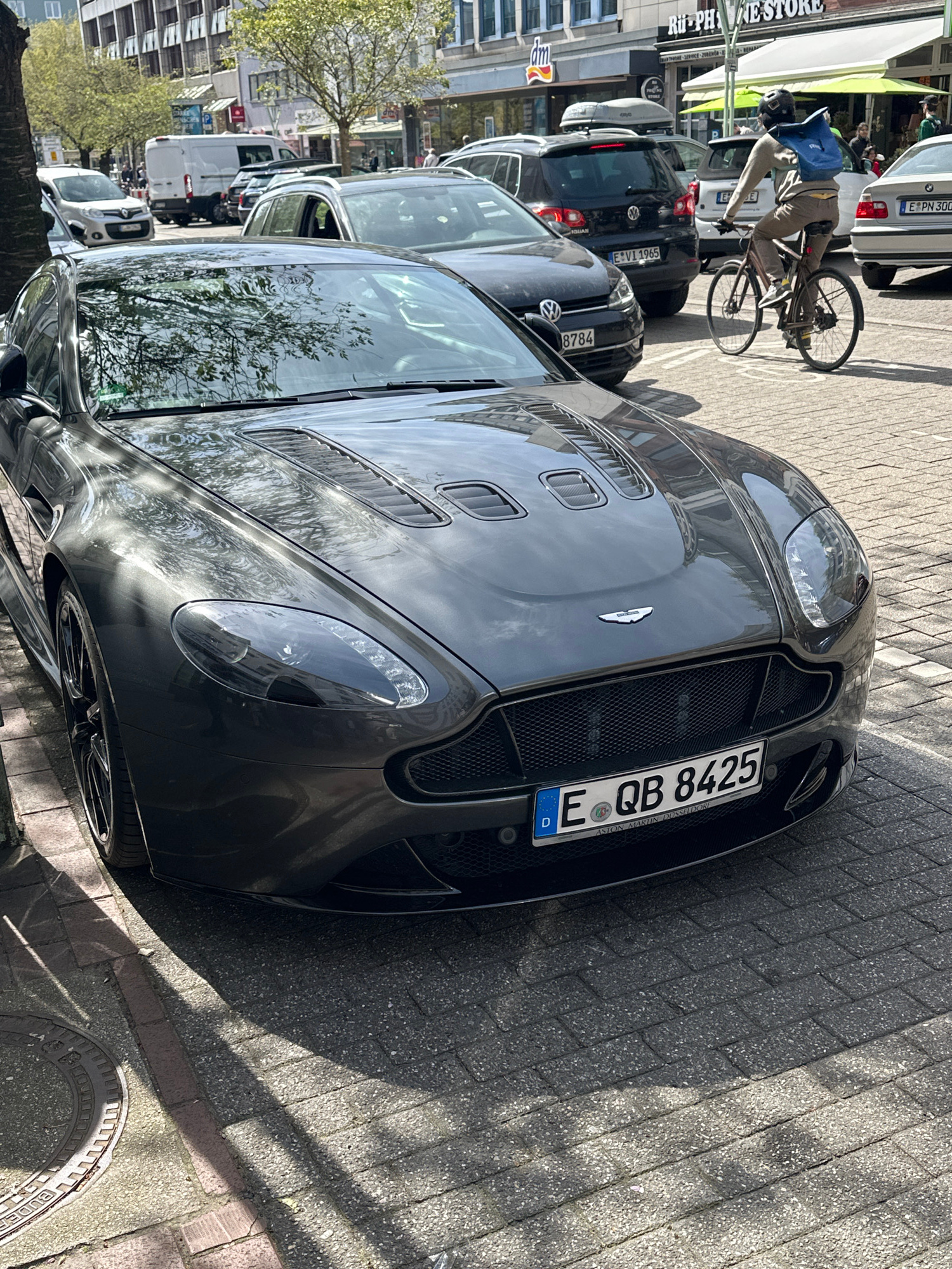 The image captures a gray Aston Martin, as indicated by the emblem above the grille, parked on a paved street in Essen, Germany. The car's license plate reads "E QB 8425". The front end of the car is…read more