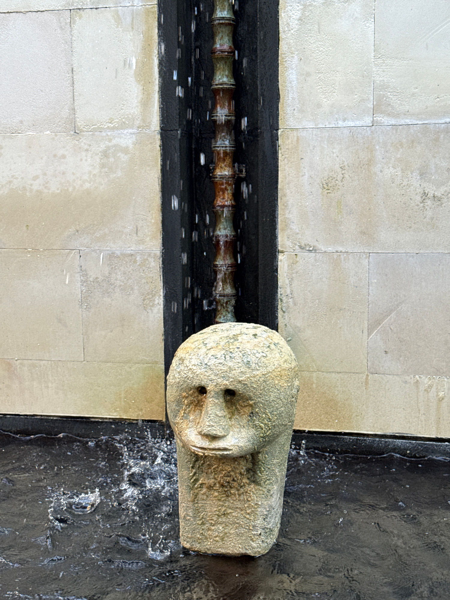 The image depicts a water fountain in Kuta Selatan, Indonesia. The fountain has a stone carving of a human face/head as its spout. The water flows from the carving into a black trough. A line of decor…read more