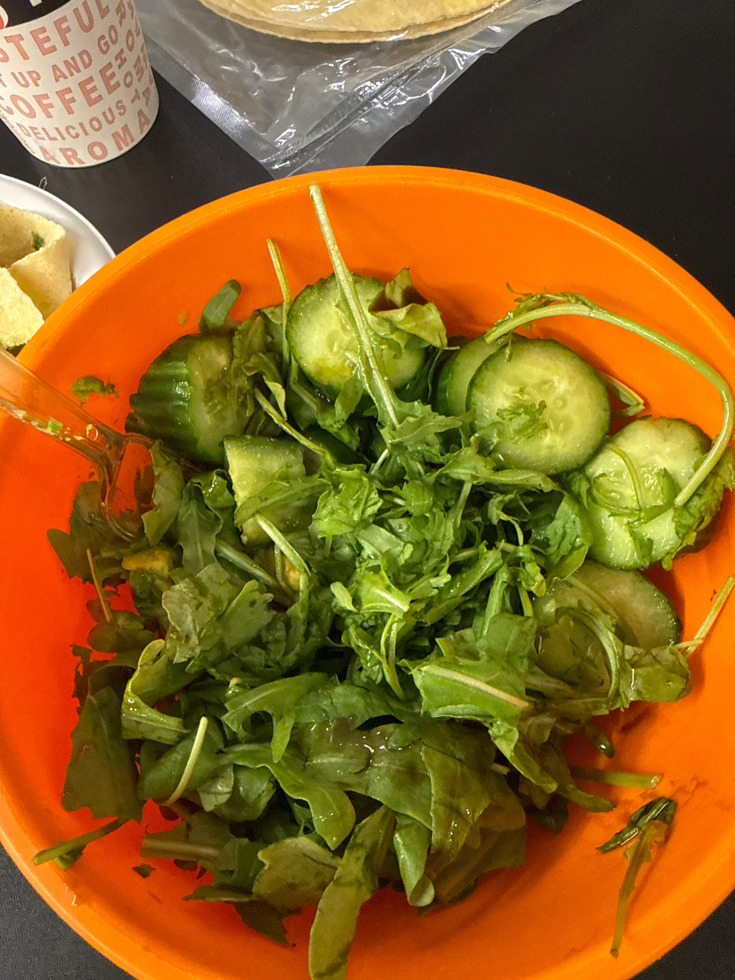 The image displays an overhead view of a fresh green salad served in a vibrant orange bowl, set against a dark, possibly black, surface. The salad is composed mainly of arugula leaves and several roun…read more