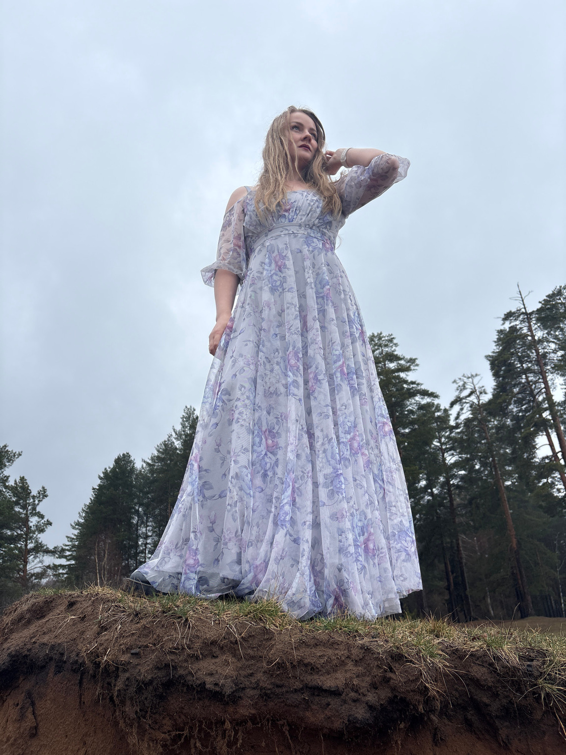 The image, currently rotated 90 degrees clockwise, depicts a woman posing outdoors. When oriented correctly, she stands on a steep dirt bank or cliff edge, looking directly towards the viewer with a n…read more